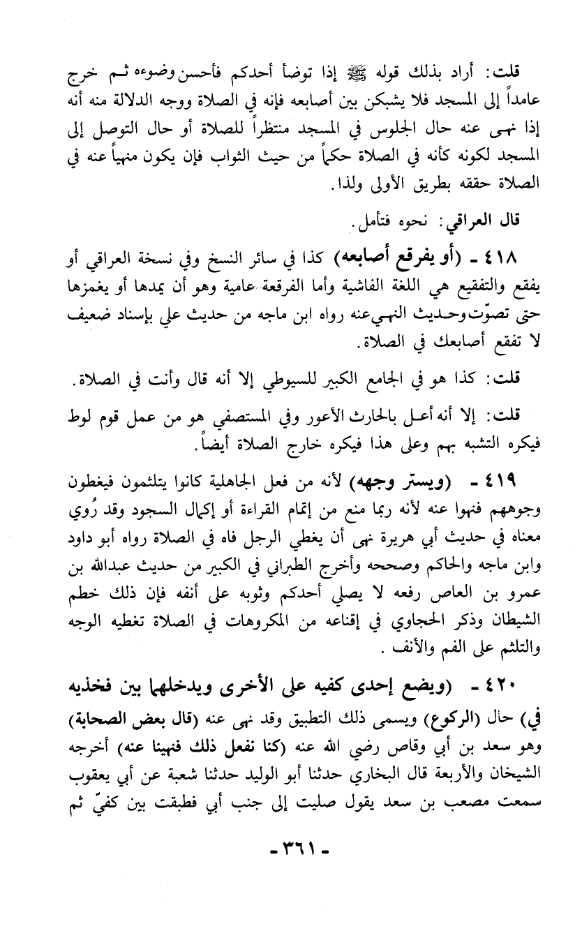 418 - (أو يفرقع أصابعه) كذا في سائر النسخ وفي نسخة العراقي أو يفقع والتفقيع هي اللغة الفاشية وأما الفرقعة عامية وهو أن يمدها أو يغمزها حتى تصوّت وحديث النهي عنه رواه ابن ماجه من حديث علي بإسناد ضعيف لا تفقع أصابعك في الصلاة.