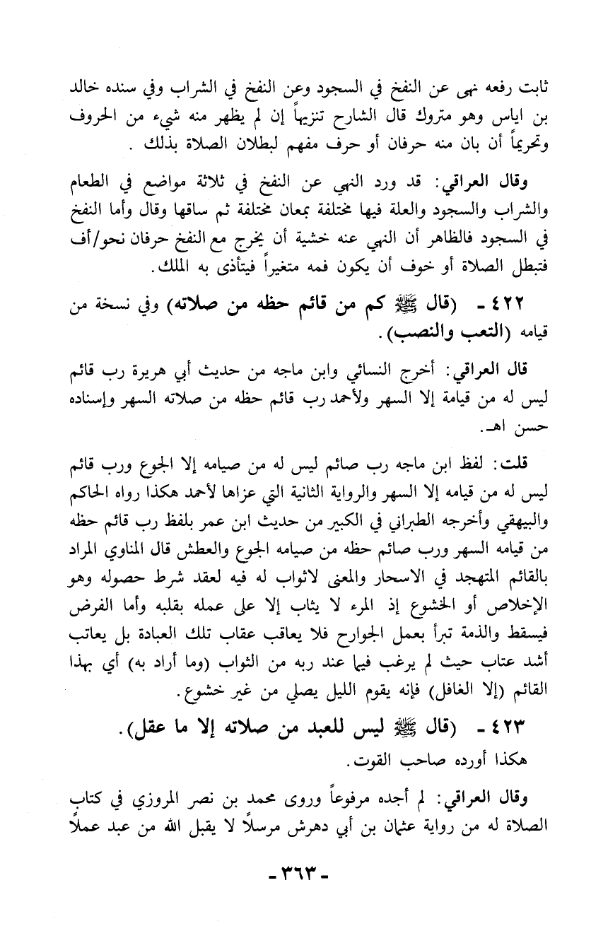 422 - (قال - صلى الله عليه وسلم - كم من قائم حظه من صلاته) وفي نسخة من قيامه (التعب والنصب).