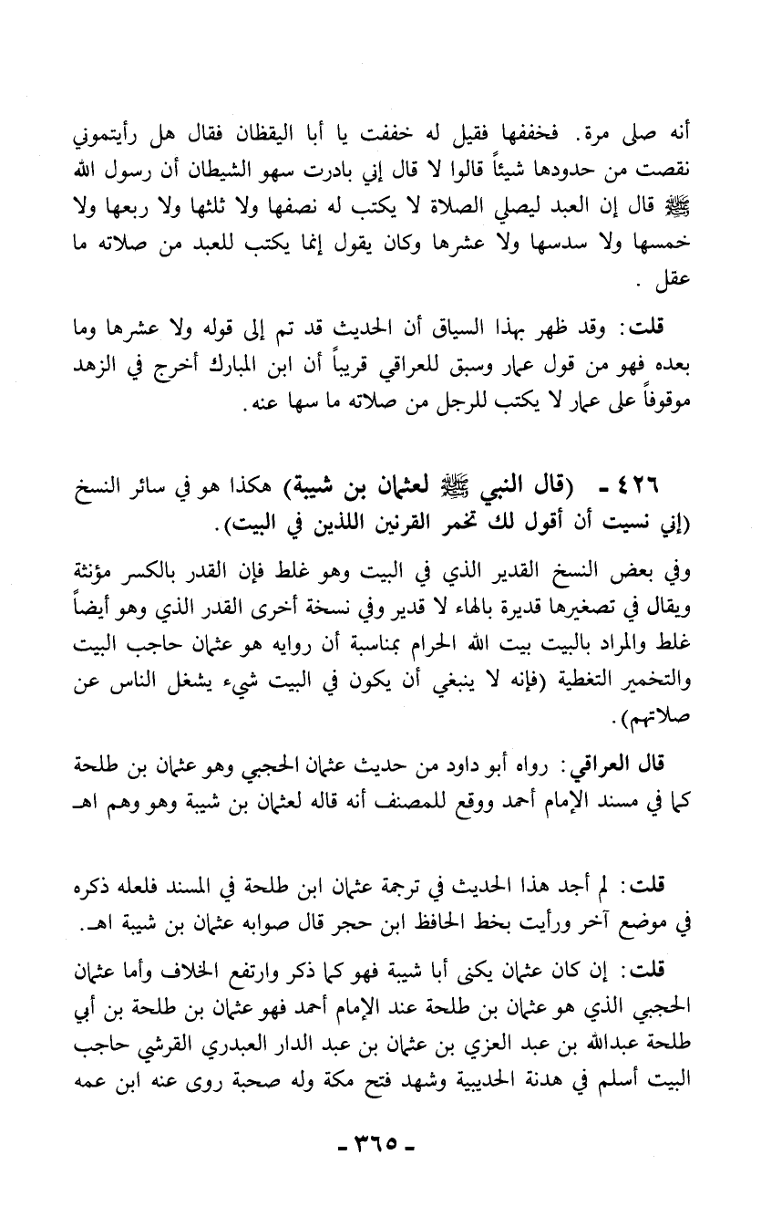 426 - (قال النبي - صلى الله عليه وسلم - لعثمان بن شيبة) هكذا هو في سائر النسخ (إني نسيت أن أقول لك تخمر القرنين اللذين في البيت).