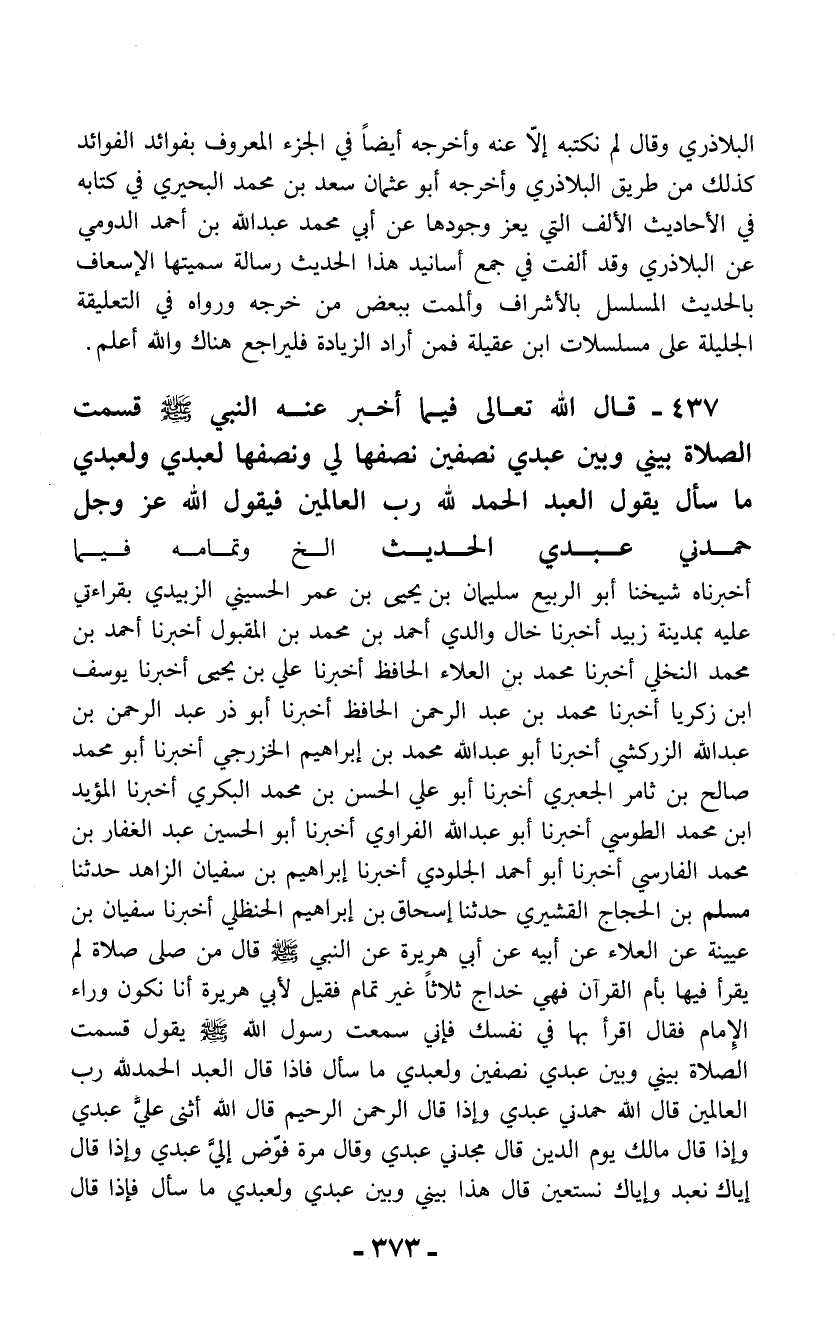 437 - قال الله تعالى فيما أخبر عنه النبي - صلى الله عليه وسلم - قسمت الصلاة بيني وبين عبدي نصفين نصفها لي ونصفها لعبدي ولعبدي ما سأل يقول العبد الحمد لله رب العالمين فيقول الله عز وجل حمدني عبدي الحديث الخ وتمامه فيما