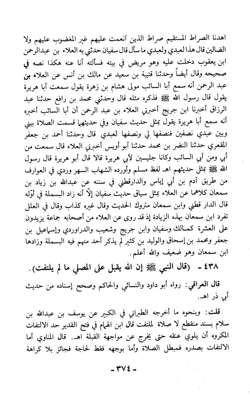 438 - (قال النبي - صلى الله عليه وسلم - إن الله يقبل على المصلي ما لم يلتفت).