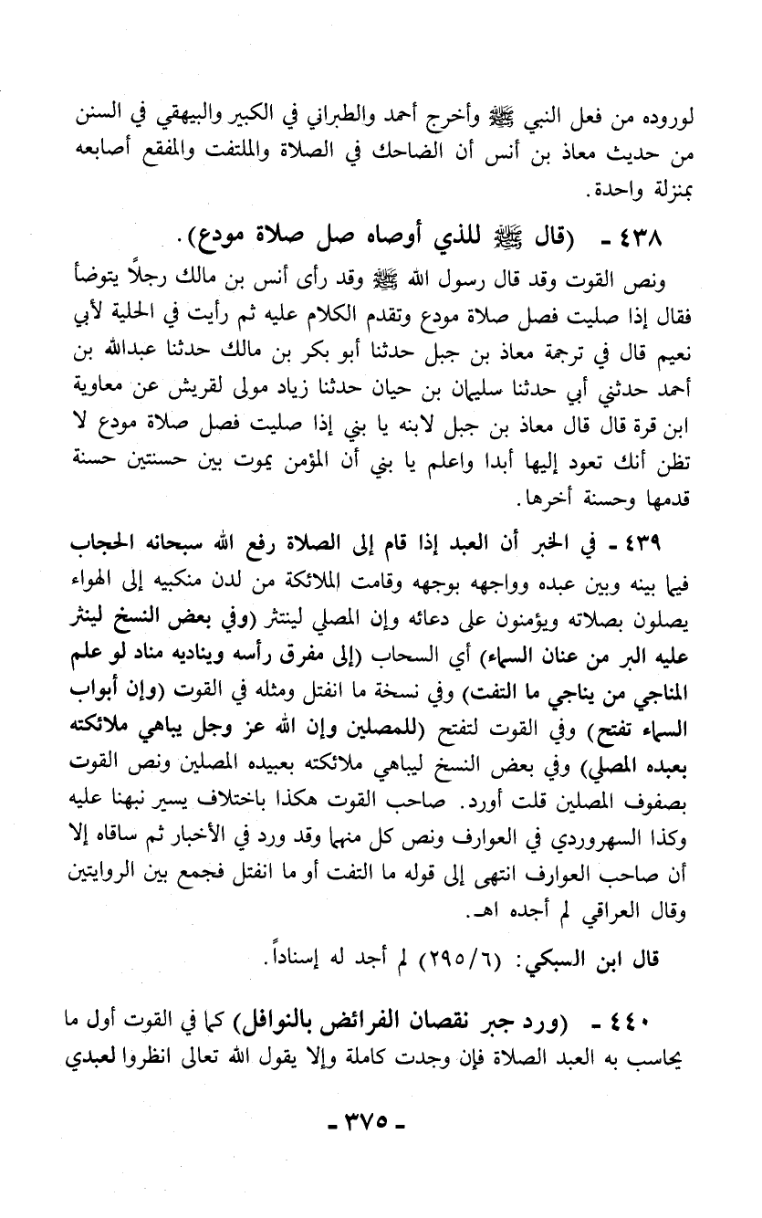 439 - في الخبر أن العبد إذا قام إلى الصلاة رفع الله سبحانه الحجاب فيما بينه وبين عبده وواجهه بوجهه وقامت الملائكة من لدن منكبيه إلى الهواء يصلون بصلاته ويؤمنون على دعائه وإن المصلي لينتثر (وفي بعض النسخ لينثر عليه البر من عنان السماء) أي السحاب (إلى مفرق رأسه ويناديه مناد لو علم المناجي من يناجي ما التفت) وفي نسخة ما انفتل ومثله في القوت (وإن أبواب السماء تفتح) وفي القوت لتفتح (للمصلين وإن الله عز وجل يباهي ملائكته بعبده المصلي) وفي بعض النسخ ليباهي ملائكته بعبيده المصلين ونص القوت بصفوف المصلين قلت أورد. صاحب القوت هكذا باختلاف يسير نبهنا عليه وكذا السهروردي في العوارف ونص كل منهما وقد ورد في الأخبار ثم ساقاه إلا أن صاحب العوارف انتهى إلى قوله ما التفت أو ما انفتل فجمع بين الروايتين وقال العراقي لم أجده اهـ.