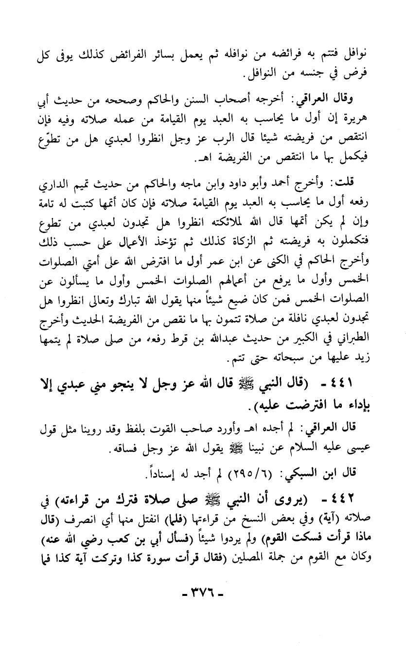 وقال العراقي: أخرجه أصحاب السنن والحاكم وصححه من حديث أبي هريرة إن أول ما يحاسب به العبد يوم القيامة من عمله صلاته وفيه فإن انتقص من فريضته شيئا قال الرب عز وجل انظروا لعبدي هل من تطوّع فيكمل بها ما انتقص من الفريضة اهـ.