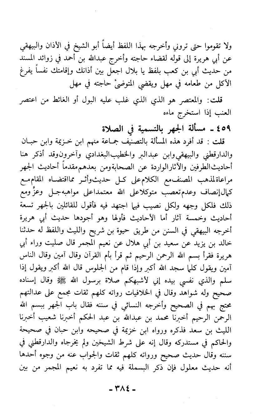 قلت: قد أفرد هذه المسألة بالتصنيف جماعة منهم ابن خزيمة وابن حبان والدارقطني والبيهقي وابن عبد البر والخطيب البغدادي وآخرون وقد أذكر هنا أحاديث الطرفين والآثار الواردة عن الصحابة ومن بعدهم مقدماً أحاديث الجهر مراعاة لمذهب المصنف مع الكلام على كل حديث وأثر مما اقتضاه المقام مع كمال إنصاف وعدم تعصب متوكلا على الله معتمدا على مواهبه جل وعزَّ ومع ذلك فلكل وجهه ولكل نصيب فيما اجتهد فيه فأقول للقائلين بالجهر تسعة أحاديث وخمسة آثار أما الأحاديث فأولها وهو أجودها حديث أبي هريرة أخرجه البيهقي في السنن من طريق حيوة بن شريح والليث واللفظ له حدثنا خالد بن يزيد عن سعيد بن أبي هلال عن نعيم المجمر قال صليت وراء أبي هريرة فقرأ بسم الله الرحمن الرحيم ثم قرأ بأم القرآن وقال آمين وقال الناس آمين ويقول كلما سجد الله أكبر وإذا قام من الجلوس قال الله أكبر ويقول إذا سلم والذي نفسي بيده إني لأشبهكم صلاة برسول الله - صلى الله عليه وسلم - وقال إسناده صحيح وله شواهد وقال في الخلافيات رواته كلهم ثقات مجمع على عدالتهم محتج بهم في الصحيح وأخرجه النسائي في سننه فقال باب الجهر ببسم الله الرحمن الرحيم أخبرنا محمد بن عبد الله بن عبد الحكم أخبرنا شعيب أخبرنا الليث بن سعد فذكره ورواه ابن خزيمة في صحيحه وابن حبان في صحيحة والحاكم في مستدركه وقال إنه على شرط الشيخين ولم يخرجاه والدارقطني في سننه وقال حديث صحيح ورواته كلهم ثقات والجواب عنه من وجوه أحدها أنه حديث معلول فإن ذكر البسملة فيه مما تفرد به نعيم المجمر من بين