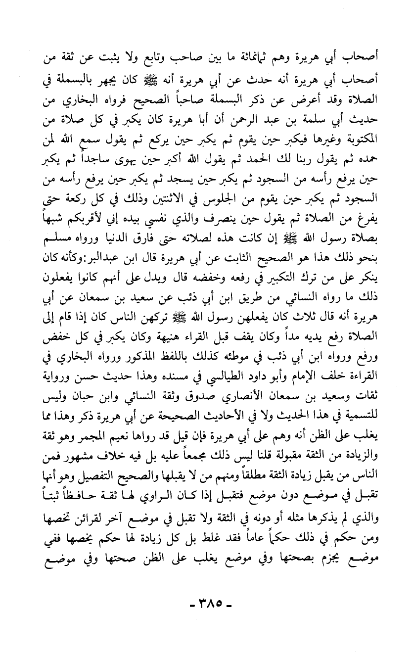 أصحاب أبي هريرة وهم ثمانمائة ما بين صاحب وتابع ولا يثبت عن ثقة من أصحاب أبي هريرة أنه حدث عن أبي هريرة أنه - صلى الله عليه وسلم - كان يجهر بالبسملة في الصلاة وقد أعرض عن ذكر البسملة صاحباً الصحيح فرواه البخاري من حديث أبي سلمة بن عبد الرحمن أن أبا هريرة كان يكبر في كل صلاة من المكتوبة وغيرها فيكبر حين يقوم ثم يكبر حين يركع ثم يقول سمع الله لمن حمده ثم يقول ربنا لك الحمد ثم يقول الله أكبر حين يهوى ساجداً ثم يكبر حين يرفع رأسه من السجود ثم يكبر حين يسجد ثم يكبر حين يرفع رأسه من السجود ثم يكبر حين يقوم من الجلوس في الاثنتين وذلك في كل ركعة حتى يفرغ من الصلاة ثم يقول حين ينصرف والذي نفسي بيده إني لأقربكم شبهاً بصلاة رسول الله - صلى الله عليه وسلم - إن كانت هذه لصلاته حتى فارق الدنيا ورواه مسلم بنحو ذلك هذا هو الصحيح الثابت عن أبي هريرة قال ابن عبد البر: وكأنه كان ينكر على من ترك التكبير في رفعه وخفضه قال ويدل على أنهم كانوا يفعلون ذلك ما رواه النسائي من طريق ابن أبي ذئب عن سعيد بن سمعان عن أبي هريرة أنه قال ثلاث كان يفعلهن رسول الله - صلى الله عليه وسلم - تركهن الناس كان إذا قام إلى الصلاة رفع يديه مداً وكان يقف قبل القراء هنيهة وكان يكبر في كل خفض ورفع ورواه ابن أبي ذئب في موطئه كذلك باللفظ المذكور ورواه البخاري في القراءة خلف الإمام وأبو داود الطيالسي في مسنده وهذا حديث حسن ورواية ثقات وسعيد بن سمعان الأنصاري صدوق وثقة النسائي وابن حبان وليس للتسمية في هذا الحديث ولا في الأحاديث الصحيحة عن أبي هريرة ذكر وهذا مما يغلب على الظن أنه وهم على أبي هريرة فإن قيل قد رواها نعيم المجمر وهو ثقة والزيادة من الثقة مقبولة قلنا ليس ذلك مجمعاً عليه بل فيه خلاف مشهور فمن الناس من يقبل زيادة الثقة مطلقاً ومنهم من لا يقبلها والصحيح التفصيل وهو أنها تقبل في موضع دون موضع فتقبل إذا كان الراوي لها ثقة حافظاً ثبتاً والذي لم يذكرها مثله أو دونه في الثقة ولا تقبل في موضع آخر لقرائن تخصها ومن حكم في ذلك حكماً عاماً فقد غلط بل كل زيادة لها حكم يخصها ففي موضع يجزم بصحتها وفي موضع يغلب على الظن صحتها وفي موضع