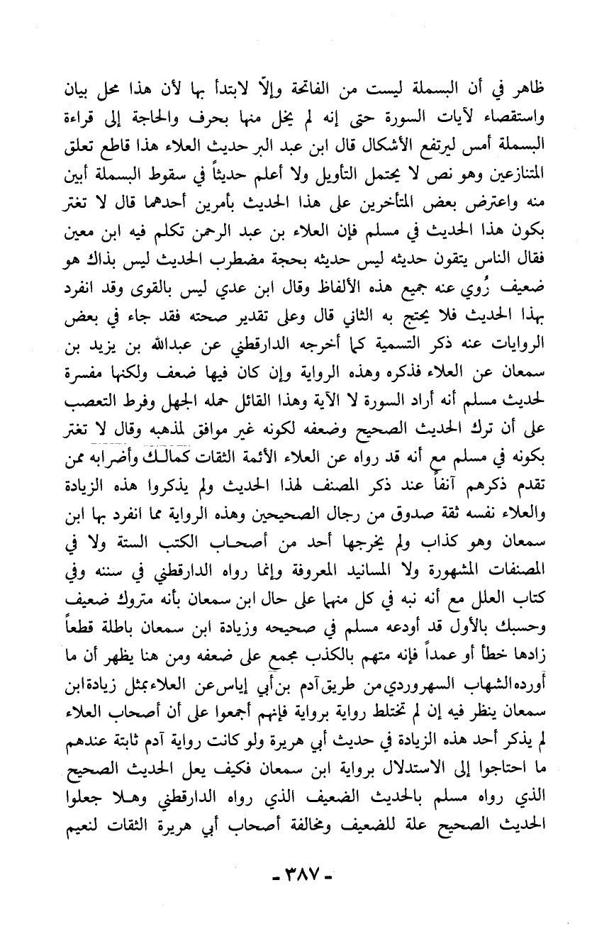 ظاهر في أن البسملة ليست من الفاتحة وإلا لابتدأ بها لأن هذا محل بيان واستقصاء لآيات السورة حتى إنه لم يخل منها بحرف والحاجة إلى قراءة البسملة أمس ليرتفع الأشكال قال ابن عبد البر حديث العلاء هذا قاطع تعلق المتنازعين وهو نص لا يحتمل التأويل ولا أعلم حديثاً في سقوط البسملة أبين منه واعترض بعض المتأخرين على هذا الحديث بأمرين أحدهما قال لا تغتر بكون هذا الحديث في مسلم فإن العلاء بن عبد الرحمن تكلم فيه ابن معين فقال الناس يتقون حديثه ليس حديثه بحجة مضطرب الحديث ليس بذاك هو ضعيف رُوي عنه جميع هذه الألفاظ وقال ابن عدي ليس بالقوى وقد انفرد بهذا الحديث فلا يحتج به الثاني قال وعلى تقدير صحته فقد جاء في بعض الروايات عنه ذكر التسمية كما أخرجه الدارقطني عن عبد الله بن يزيد بن سمعان عن العلاء فذكره وهذه الرواية وإن كان فيها ضعف ولكنها مفسرة لحديث مسلم أنه أراد السورة لا الآية وهذا القائل حمله الجهل وفرط التعصب على أن ترك الحديث الصحيح وضعفه لكونه غير موافق لمذهبه وقال لا تغتر بكونه في مسلم مع أنه قد رواه عن العلاء الأئمة الثقات كمالك وأضرابه ممن تقدم ذكرهم آنفاً عند ذكر المصنف لهذا الحديث ولم يذكروا هذه الزيادة والعلاء نفسه ثقة صدوق من رجال الصحيحين وهذه الرواية مما انفرد بها ابن سمعان وهو كذاب ولم يخرجها أحد من أصحاب الكتب الستة ولا في المصنفات المشهورة ولا المسانيد المعروفة وإنما رواه الدارقطني في سننه وفي كتاب العلل مع أنه نبه في كل منهما على حال ابن سمعان بأنه متروك ضعيف وحسبك بالأول قد أودعه مسلم في صحيحه وزيادة ابن سمعان باطلة قطعاً زادها خطأ أو عمداً فإنه متهم بالكذب مجمع على ضعفه ومن هنا يظهر أن ما أورده الشهاب السهروردي من طريق آدم بن أبي إياس عن العلاء بمثل زيادة ابن سمعان ينظر فيه إن لم تختلط رواية برواية فإنهم أجمعوا على أن أصحاب العلاء لم يذكر أحد هذه الزيادة في حديث أبي هريرة ولو كانت رواية آدم ثابتة عندهم ما احتاجوا إلى الاستدلال برواية ابن سمعان فكيف يعل الحديث الصحيح الذي رواه مسلم بالحديث الضعيف الذي رواه الدارقطني وهلا جعلوا الحديث الصحيح علة للضعيف ومخالفة أصحاب أبي هريرة الثقات لنعيم