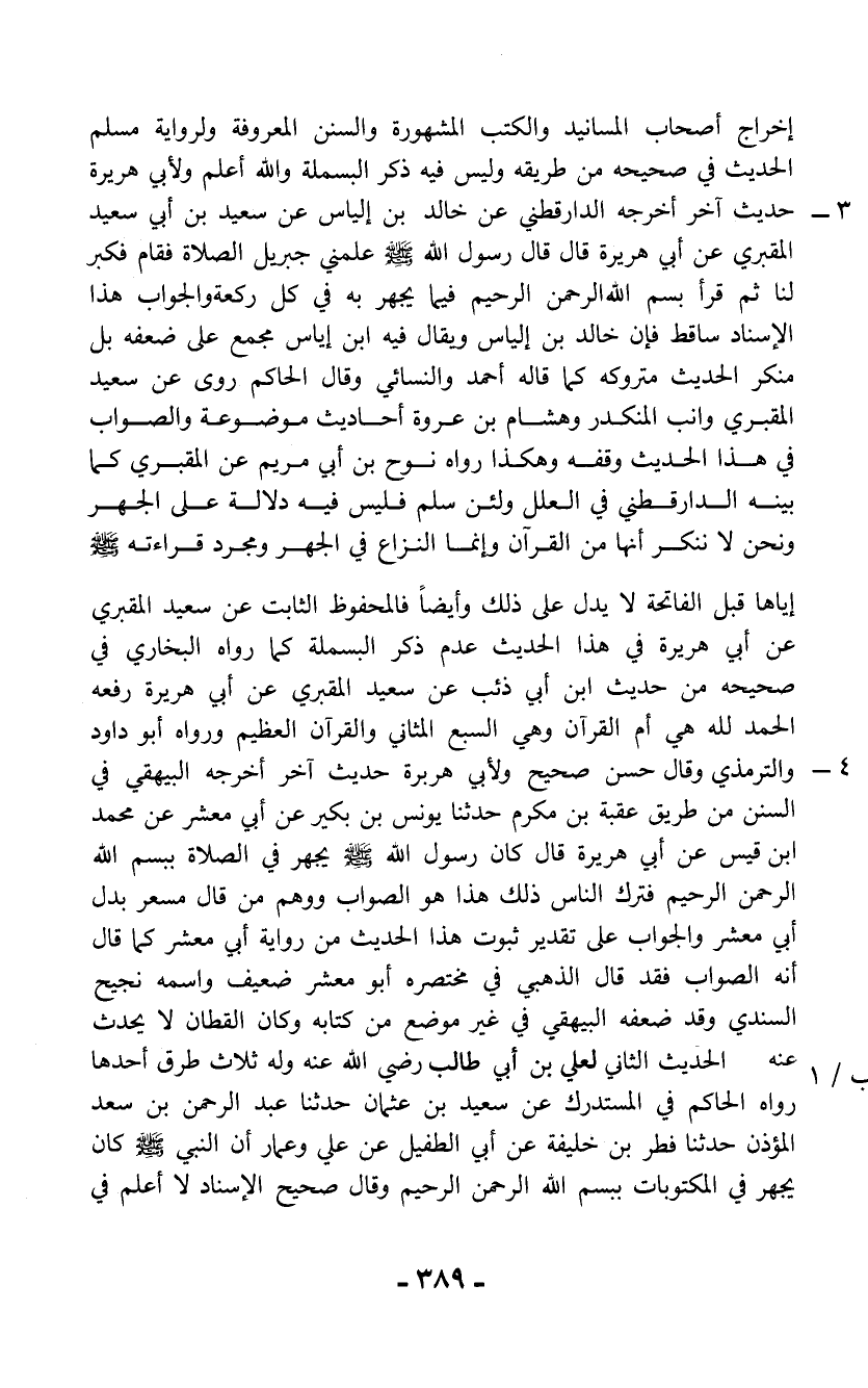 إخراج أصحاب المسانيد والكتب المشهورة والسنن المعروفة ولرواية مسلم الحديث في صحيحه من طريقه وليس فيه ذكر البسملة والله أعلم ولأبي هريرة 3 - حديث آخر أخرجه الدارقطني عن خالد بن إلياس عن سعيد بن أبي سعيد المقبري عن أبي هريرة قال قال رسول الله - صلى الله عليه وسلم - علمني جبريل الصلاة فقام فكبر لنا ثم قرأ بسم الله الرحمن الرحيم فيما يجهر به في كل ركعة والجواب هذا الإسناد ساقط فإن خالد بن إلياس ويقال فيه ابن إياس مجمع على ضعفه بل منكر الحديث متروكه كما قاله أحمد والنسائي وقال الحاكم روى عن سعيد المقبري وابن المنكدر وهشام بن عروة أحاديث موضوعة والصواب في هذا الحديث وقفه وهكذا رواه نوح بن أبي مريم عن المقبري كما بينه الدارقطني في العلل ولئن سلم فليس فيه دلالة على الجهر ونحن لا ننكر أنها من القرآن وإنما النزاع في الجهر ومجرد قراءته - صلى الله عليه وسلم - إياها قبل الفاتحة لا يدل على ذلك وأيضاً فالمحفوظ الثابت عن سعيد المقبري عن أبي هريرة في هذا الحديث عدم ذكر البسملة كما رواه البخاري في صحيحه من حديث ابن أبي ذئب عن سعيد المقبري عن أبي هريرة رفعه الحمد لله هي أم القرآن وهي السبع المثاني والقرآن العظيم ورواه أبو داود