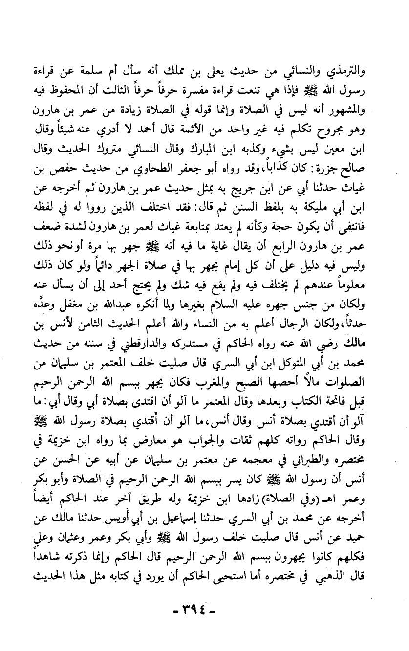 والترمذي والنسائي من حديث يعلى بن مملك أنه سأل أم سلمة عن قراءة رسول الله - صلى الله عليه وسلم - فإذا هي تنعت قراءة مفسرة حرفاً حرفاً الثالث أن المحفوظ فيه والمشهور أنه ليس في الصلاة وإنما قوله في الصلاة زيادة من عمر بن هارون وهو مجروح تكلم فيه غير واحد من الأئمة قال أحمد لا أدري عنه شيئاً وقال ابن معين ليس بشيء وكذبه ابن المبارك وقال النسائي متروك الحديث وقال صالح جزرة: كان كذاباً، وقد رواه أبو جعفر الطحاوي من حديث حفص بن غياث حدثنا أبي عن ابن جريج به بمثل حديث عمر بن هارون ثم أخرجه عن ابن أبي مليكة به بلفظ السنن ثم قال: فقد اختلف الذين رووا له في لفظه فانتفى أن يكون حجة وكأنه لم يعتد بمتابعة غياث لعمر بن هارون لشدة ضعف عمر بن هارون الرابع أن يقال غاية ما فيه أنه - صلى الله عليه وسلم - جهر بها مرة أونحو ذلك وليس فيه دليل على أن كل إمام يجهر بها في صلاة الجهر دائماً ولو كان ذلك معلوماً عندهم لم يختلف فيه ولم يقع فيه شك ولم يحتج أحد إلى أن يسأل عنه ولكان من جنس جهره عليه السلام بغيرها ولما أنكره عبد الله بن مغفل وعدّه حدثاً، ولكان الرجال أعلم به من النساء والله أعلم الحديث الثامن لأنس بن مالك رضي الله عنه رواه الحاكم في مستدركه والدارقطني في سننه من حديث محمد بن أبي المتوكل ابن أبي السري قال صليت خلف المعتمر بن سليمان من الصلوات مالاً أحصها الصبح والمغرب فكان يجهر ببسم الله الرحمن الرحيم قبل فاتحة الكتاب وبعدها وقال المعتمر ما آلو أن اقتدى بصلاة أبي وقال أبي: ما آلو أن أقتدي بصلاة أنس وقال أنس، ما آلو أن أقتدي بصلاة رسول الله - صلى الله عليه وسلم - وقال الحاكم رواته كلهم ثقات والجواب هو معارض بما رواه ابن خزيمة في مختصره والطبراني في معجمه عن معتمر بن سليمان عن أبيه عن الحسن عن أنس أن رسول الله - صلى الله عليه وسلم - كان يسر ببسم الله الرحمن الرحيم في الصلاة وأبو بكر وعمر اهـ (وفي الصلاة) زادها ابن خزيمة وله طريق آخر عند الحاكم أيضاً أخرجه عن محمد بن أبي السري حدثنا إسماعيل بن أبي أويس حدثنا مالك عن حميد عن أنس قال صليت خلف رسول الله - صلى الله عليه وسلم - وأبي بكر وعمر وعثمان وعلي فكلهم كانوا يجهرون ببسم الله الرحمن الرحيم قال الحاكم وإنما ذكرته شاهداً قال الذهبي في مختصره أما استحى الحاكم أن يورد في كتابه مثل هذا الحديث