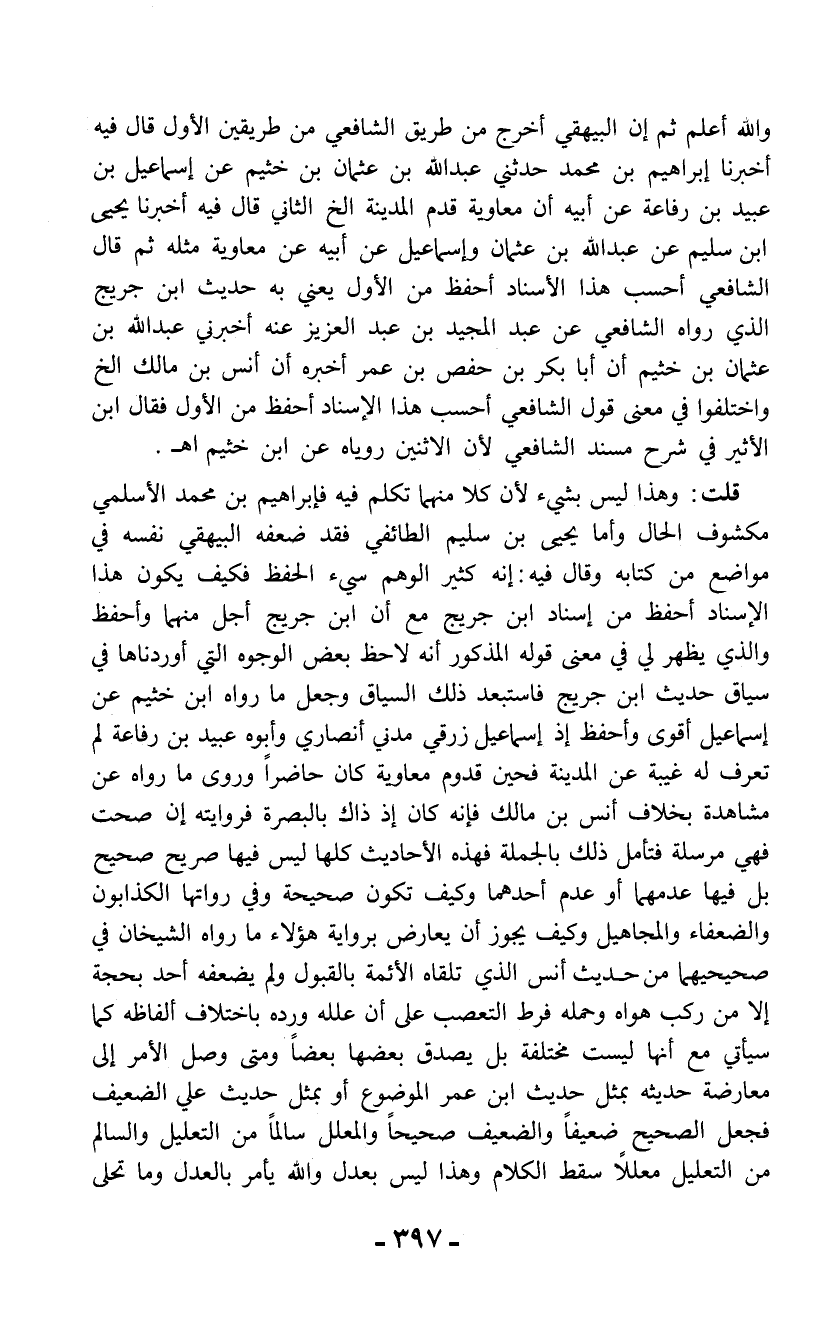 قلت: وهذا ليس بشيء لأن كلا منهما تكلم فيه فإبراهيم بن محمد الأسلمي مكشوف الحال وأما يحيى بن سليم الطائفي فقد ضعفه البيهقي نفسه في مواضع من كتابه وقال فيه: إنه كثير الوهم سيء الحفظ فكيف يكون هذا الإسناد أحفظ من إسناد ابن جريج مع أن ابن جريج أجل منهما وأحفظ والذي يظهر لي في معنى قوله المذكور أنه لاحظ بعض الوجوه التي أوردناها في سياق حديث ابن جريج فاستبعد ذلك السياق وجعل ما رواه ابن خثيم عن إسماعيل أقوى وأحفظ إذ إسماعيل زرقي مدني أنصاري وأبوه عبيد بن رفاعة لم تعرف له غيبة عن المدينة فحين قدوم معاوية كان حاضراً وروى ما رواه عن مشاهدة بخلاف أنس بن مالك فإنه كان إذ ذاك بالبصرة فروايته إن صحت فهي مرسلة فتأمل ذلك بالجملة فهذه الأحاديث كلها ليس فيها صريح صحيح بل فيها عدمهما أو عدم أحدهما وكيف تكون صحيحة وفي رواتها الكذابون والضعفاء والمجاهيل وكيف يجوز أن يعارض برواية هؤلاء ما رواه الشيخان في صحيحيهما من حديث أنس الذي تلقاه الأئمة بالقبول ولم يضعفه أحد بحجة إلا من ركب هواه وحمله فرط التعصب على أن علله ورده باختلاف ألفاظه كما سيأتي مع أنها ليست مختلفة بل يصدق بعضها بعضاً ومتى وصل الأمر إلى معارضة حديثه بمثل حديث ابن عمر الموضوع أو بمثل حديث علي الضعيف فجعل الصحيح ضعيفاً والضعيف صحيحاً والمعلل سالماً من التعليل والسالم من التعليل معللاً سقط الكلام وهذا ليس بعدل والله يأمر بالعدل وما تحلى