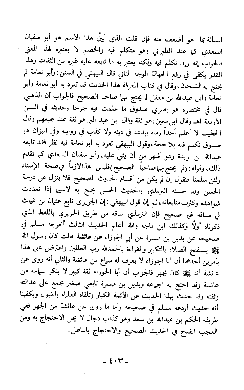 المسألة بما هو أضعف منه فإن قلت الذي بَيَّن هذا الاسم هو أبو سفيان السعدي كما عند الطبراني وهو متكلم فيه والخصم لا يعتبره لهذا العني فالجواب إنه وإن تكلم فيه ولكنه يعتبر به ما تابعه عليه غيره من الثقات وهذا القدر يكفي في رفع الجهالة الوجه الثاني قال البيهقي في السنن: وأبو نعامة لم يحتج به الشيخان، وقال في كتاب المعرفة هذا الحديث قد تفرد به أبو نعامة وأبو نعامة وابن عبد الله بن مغفل لم يحتج بهما صاحبا الصحيح فالجواب أن الذهبي قال في مختصره هو بصري صدوق ما علمت فيه جرحا وحديثه في السنن الأربعة اهـ وقال ابن معين: هو ثقة وقال ابن عبد البر هو ثقة عند جميعهم وقال الخطيب لا أعلم أحداً رماه ببدعة في دينه ولا كذب في روايته وفي الميزان هو صدوق تكلم فيه بلا حجة، وقول البيهقي تفرد به أبو نعامة فيه نظر فقد تابعه عبد الله بن بريدة وهو أشهر من أن يثني عليه، وأبو سفيان السعدي كما تقدم ذلك، وقوله: (لم يحتج بهما صاحبا الصحيح) فليس هذا لازماً في صحة الإسناد ولئن سلمنا فنقول إن لم يكن من أقسام الحديث الصحيح فلا ينزل عن درجة الحسن وقد حسنه الترمذي والحديث الحسن يحتج به لاسيما إذا تعددت شواهده وكثرت متابعاته، ثم إن قول البيهقي: إن الجريري تابع عثمان بن غياث في سياقه غير صحيح فإن الترمذي ساقه من طريق الجريري باللفظ الذي ذكرناه أولاً وكذلك ابن ماجه والله أعلم الحديث الثالث أخرجه مسلم في صحيحه عن بديل بن ميسرة عن أبي الجوزاء عن عائشة قالت كان رسول الله - صلى الله عليه وسلم - يستفتح الصلاة بالتكبير والقراءة بالحمد لله رب العالمين واعترض على هذا بأمرين أحدهما أن أبا الجوزاء لا يعرف له سماع من عائشة والثاني أنه روى عن عائشة أنه - صلى الله عليه وسلم - كان يجهر فالجواب أن أبا الجوزاء ثقة كبير لا ينكر سماعه من عائشة وقد احتج به الجماعة وبديل بن ميسرة تابعي صغير مجمع على عدالته وثقته وقد حدث بهذا الحديث عن الأئمة الكبار وتلقاه العلماء بالقبول ويكفينا أنه حديث أودعه مسلم في صحيحه وأما ما روى عن عائشة من الجهر ففي طريقه الحكم بن عبد الله بن سعد وهو كذاب دجال لا يحل الاحتجاج به ومن العجب القدح في الحديث الصحيح والاحتجاج بالباطل.