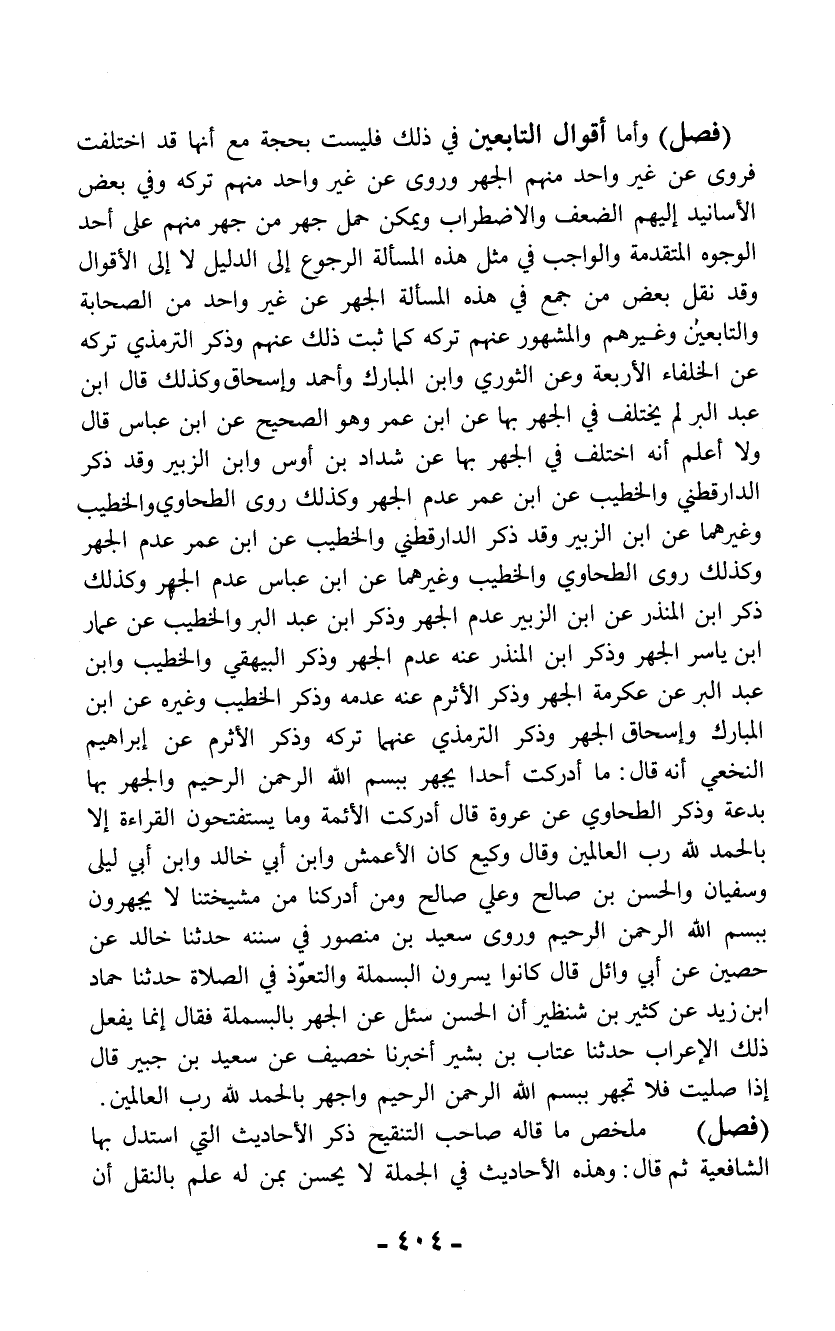 (فصل) وأما أقوال التابعين في ذلك فليست بحجة مع أنها قد اختلفت فروى عن غير واحد منهم الجهر وروى عن غير واحد منهم تركه وفي بعض الأسانيد إليهم الضعف والاضطراب ويمكن حمل جهر من جهر منهم على أحد الوجوه المتقدمة والواجب في مثل هذه المسألة الرجوع إلى الدليل لا إلى الأقوال وقد نقل بعض من جمع في هذه المسألة الجهر عن غير واحد من الصحابة والتابعين وغيرهم والمشهور عنهم تركه كما ثبت ذلك عنهم وذكر الترمذي تركه عن الخلفاء الأربعة وعن الثوري وابن المبارك وأحمد وإسحاق وكذلك قال ابن عبد البر لم يختلف في الجهر بها عن ابن عمر وهو الصحيح عن ابن عباس قال ولا أعلم أنه اختلف في الجهر بها عن شداد بن أوس وابن الزبير وقد ذكر الدارقطني والخطيب عن ابن عمر عدم الجهر وكذلك روى الطحاوي والخطيب وغيرهما عن ابن الزبير وقد ذكر الدارقطني والخطيب عن ابن عمر عدم الجهر وكذلك روى الطحاوي والخطيب وغيرهما عن ابن عباس عدم الجهر وكذلك ذكر ابن المنذر عن ابن الزبير عدم الجهر وذكر ابن عبد البر والخطيب عن عمار ابن ياسر الجهر وذكر ابن المنذر عنه عدم الجهر وذكر البيهقي والخطيب وابن عبد البر عن عكرمة الجهر وذكر الأثرم عنه عدمه وذكر الخطيب وغيره عن ابن المبارك وإسحاق الجهر وذكر الترمذي عنهما تركه وذكر الأثرم عن إبراهيم النخعي أنه قال: ما أدركت أحدا يجهر ببسم الله الرحمن الرحيم والجهر بها بدعة وذكر الطحاوي عن عروة قال أدركت الأئمة وما يستفتحون القراءة إلا بالحمد لله رب العالمين وقال وكيع كان الأعمش وابن أبي خالد وابن أبي ليلى وسفيان والحسن بن صالح وعلي صالح ومن أدركنا من مشيختنا لا يجهرون ببسم الله الرحمن الرحيم وروى سعيد بن منصور في سننه حدثنا خالد عن حصين عن أبي وائل قال كانوا يسرون البسملة والتعوّذ في الصلاة حدثنا حماد ابن زيد عن كثير بن شنظير أن الحسن سئل عن الجهر بالبسملة فقال إنما يفعل ذلك الإعراب حدثنا عتاب بن بشير أخبرنا خصيف عن سعيد بن جبير قال إذا صليت فلا تجهر ببسم الله الرحمن الرحيم واجهر بالحمد لله رب العالمين.