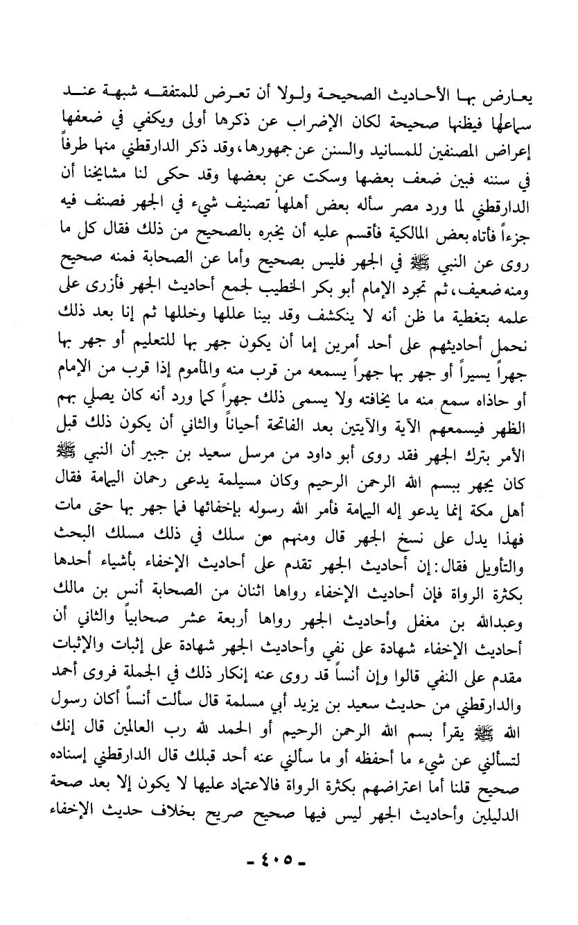 يعارض بها الأحاديث الصحيحة ولولا أن تعرض للمتفقه شبهة عند سماعها فيظنها صحيحة لكان الإضراب عن ذكرها أولى ويكفي في ضعفها إعراض المصنفين للمسانيد والسنن عن جمهورها، وقد ذكر الدارقطني منها طرفاً في سننه فبين ضعف بعضها وسكت عن بعضها وقد حكى لنا مشايخنا أن الدارقطني لما ورد مصر سأله بعض أهلها تصنيف شيء في الجهر فصنف فيه جزءاً فأتاه بعض المالكية فأقسم عليه أن يخبره بالصحيح من ذلك فقال كل ما روى عن النبي - صلى الله عليه وسلم - في الجهر فليس بصحيح وأما عن الصحابة فمنه صحيح ومنه ضعيف، ثم تجرد الإمام أبو بكر الخطيب لجمع أحاديث الجهر فأزرى على علمه بتغطية ما ظن أنه لا ينكشف وقد بينا عللها وخللها ثم إنا بعد ذلك نحمل أحاديثهم على أحد أمرين إما أن يكون جهر بها للتعليم أو جهر بها جهراً يسيراً أو جهر بها جهراً يسمعه من قرب منه والمأموم إذا قرب من الإمام أو حاذاه سمع منه ما يخافته ولا يسمى ذلك جهراً كما ورد أنه كان يصلي بهم الظهر فيسمعهم الآية والآيتين بعد الفاتحة أحياناً والثاني أن يكون ذلك قبل الأمر بترك الجهر فقد روى أبو داود من مرسل سعيد بن جبير أن النبي - صلى الله عليه وسلم - كان يجهر ببسم الله الرحمن الرحيم وكان مسيلمة يدعى رحمان اليمامة فقال أهل مكة إنما يدعو إله اليمامة فأمر الله رسوله بإخفائها فما جهر بها حتى مات فهذا يدل على نسخ الجهر قال ومنهم من سلك في ذلك مسلك البحث والتأويل فقال: إن أحاديث الجهر تقدم على أحاديث الإخفاء بأشياء أحدها بكثرة الرواة فإن أحاديث الإخفاء رواها اثنان من الصحابة أنس بن مالك وعبد الله بن مغفل وأحاديث الجهر رواها أربعة عشر صحابياً والثاني أن أحاديث الإخفاء شهادة على نفي وأحاديث الجهر شهادة على إثبات والإثبات مقدم على النفي قالوا وإن أنساً قد روى عنه إنكار ذلك في الجملة فروى أحمد والدارقطني من حديث سعيد بن يزيد أبي مسلمة قال سألت أنساً أكان رسول الله - صلى الله عليه وسلم - يقرأ بسم الله الرحمن الرحيم أو الحمد لله رب العالمين قال إنك لتسألني عن شيء ما أحفظه أو ما سألني عنه أحد قبلك قال الدارقطني إسناده صحيح قلنا أما اعتراضهم بكثرة الرواة فالاعتماد عليها لا يكون إلا بعد صحة الدليلين وأحاديث الجهر ليس فيها صحيح صريح بخلاف حديث الإخفاء