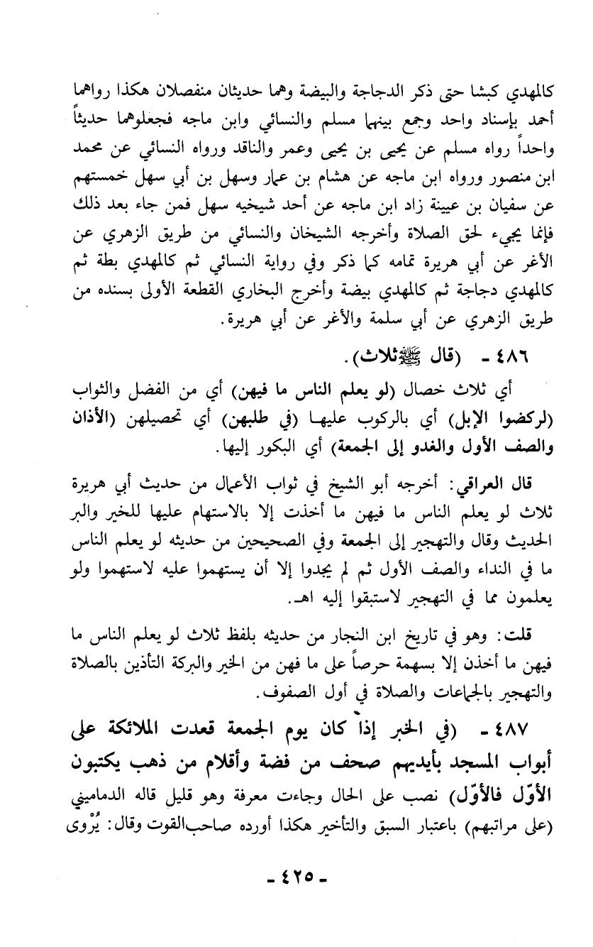 كالمهدي كبشا حتى ذكر الدجاجة والبيضة وهما حديثان منفصلان هكذا رواهما أحمد بإسناد واحد وجمع بينهما مسلم والنسائي وابن ماجه فجعلوهما حديثاً واحداً رواه مسلم عن يحيى بن يحيى وعمر والناقد ورواه النسائي عن محمد ابن منصور ورواه ابن ماجه عن هشام بن عمار وسهل بن أبي سهل خمستهم عن سفيان بن عيينة زاد ابن ماجه عن أحد شيخيه سهل فمن جاء بعد ذلك فإنما يجيء لحق الصلاة وأخرجه الشيخان والنسائي من طريق الزهري عن الأغر عن أبي هريرة تمامه كما ذكر وفي رواية النسائي ثم كالمهدي بطة ثم كالمهدي دجاجة ثم كالمهدي بيضة وأخرج البخاري القطعة الأولى بسنده من طريق الزهري عن أبي سلمة والأغر عن أبي هريرة.