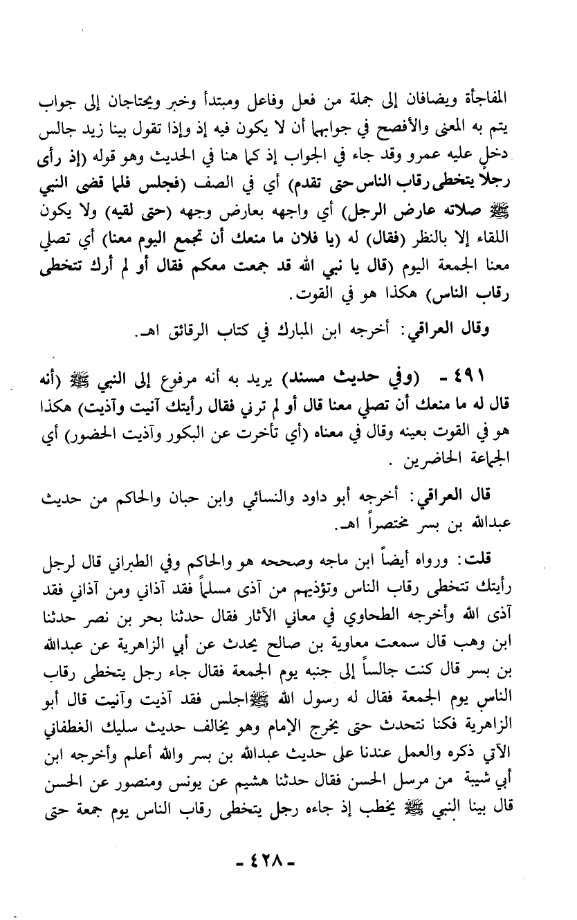 قلت: ورواه أيضاً ابن ماجه وصححه هو والحاكم وفي الطبراني قال لرجل رأيتك تتخطى رقاب الناس وتؤذيهم من آذى مسلماً فقد آذاني ومن آذاني فقد آذى الله وأخرجه الطحاوي في معاني الآثار فقال حدثنا بحر بن نصر حدثنا ابن وهب قال سمعت معاوية بن صالح يحدث عن أبي الزاهرية عن عبد الله بن بسر قال كنت جالساً إلى جنبه يوم الجمعة فقال جاء رجل يتخطى رقاب الناس يوم الجمعة فقال له رسول الله - صلى الله عليه وسلم - اجلس فقد آذيت وآنيت قال أبو الزاهرية فكنا نتحدث حتى يخرج الإمام وهو يخالف حديث سليك الغطفاني الآتي ذكره والعمل عندنا على حديث عبد الله بن بسر والله أعلم وأخرجه ابن أبي شيبة من مرسل الحسن فقال حدثنا هشيم عن يونس ومنصور عن الحسن قال بينا النبي - صلى الله عليه وسلم - يخطب إذ جاءه رجل يتخطى رقاب الناس يوم جمعة حتى
