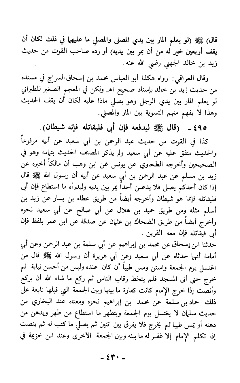 495 - (قال - صلى الله عليه وسلم - ليدفعه فإن أبى فليقاتله فإنه شيطان).