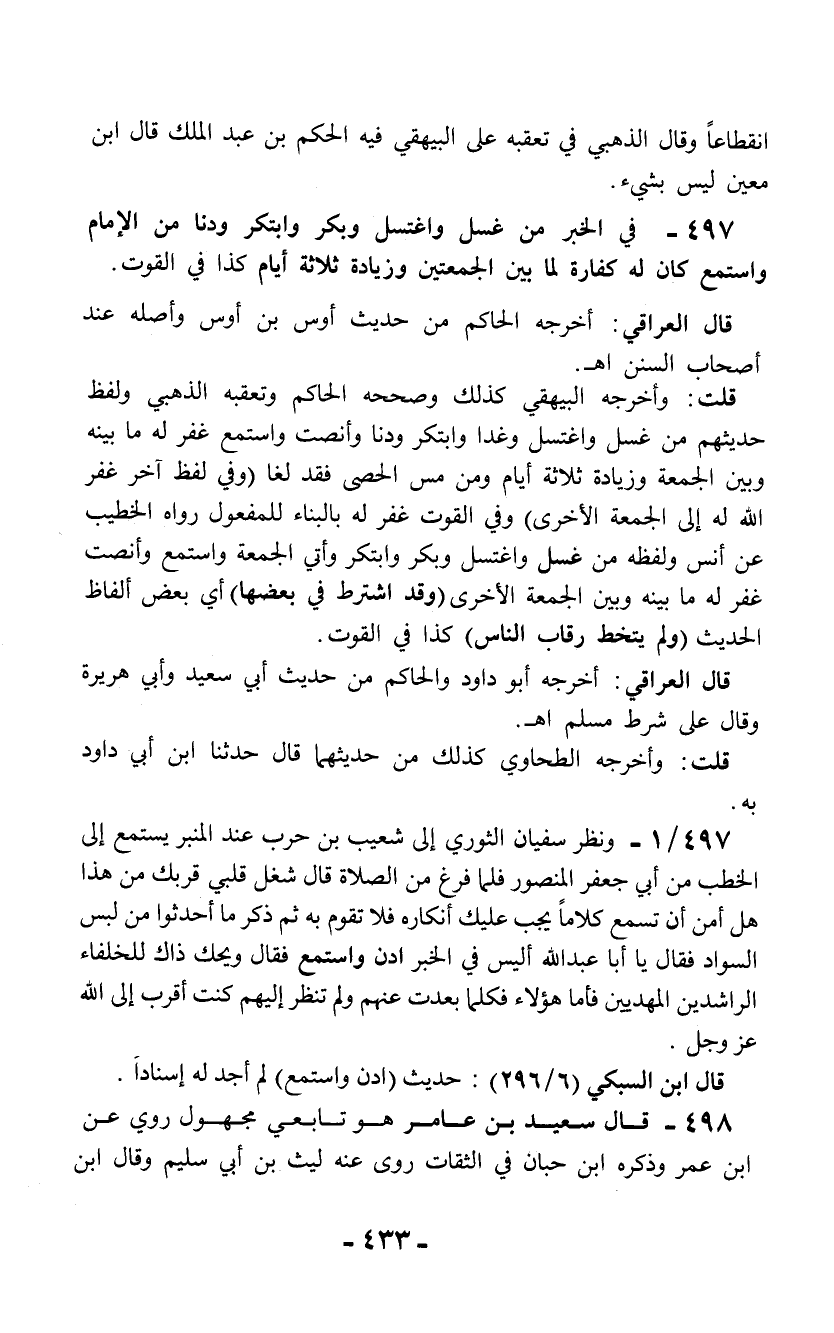 497 - في الخبر من غسل واغتسل وبكر وابتكر ودنا من الإمام واستمع كان له كفارة لما بين الجمعتين وزيادة ثلاثة أيام كذا في القوت.