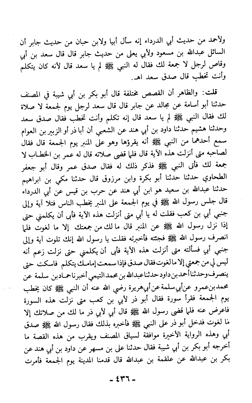 قلت: والظاهر أن القصص مختلفة قال أبو بكر بن أبي شيبة في المصنف حدثنا أبو أسامة عن مجالد عن جابر قال قال سعد لرجل يوم لجمعة لا صلاة لك فقال النبي - صلى الله عليه وسلم - لم يا سعد قال إنه تكلم وأنت تخطب فقال صدق سعد وحدثنا هشيم حدثنا داود بن أبي هند عن الشعبي أن أبا ذر أو الزبير بن العوام سمع أحدهما من النبي - صلى الله عليه وسلم - أنه يقرؤها وهو على المنبر يوم الجمعة قال فقال لصاحبه متى أنزلت هذه الآية قال فلما قضى صلاته قال له عمر بن الخطاب لا جمعة لك فأتى النبي - صلى الله عليه وسلم - فذكر ذلك له فقال صدق عمر وقال أبو جعفر الطحاوي حدثنا حدثنا أبو بكرة وابن مرزوق قال حدثنا مكي بن إبراهيم حدثنا عبد الله بن سعيد هو ابن أبي هند عن حرب بن قيس عن أبي الدرداء قال جلس رسول الله - صلى الله عليه وسلم - في يوم الجمعة على المنبر يخطب الناس فتلا آية وإلى جنبي أبي بن كعب فقلت له يا أبي متى أنزلت هذه الآية فأبى أن يكلمني حتى إذا نزل رسول الله - صلى الله عليه وسلم - عن المنبر قال ما لك من جمعتك إلا ما لغوت فلما انصرف رسول الله - صلى الله عليه وسلم - فجئته فأخبرته فقلت يا رسول الله إنك تلوت آية وإلى جنبي أبي فسألته متى أنزلت هذه الآية فأبى أن يكلمني حتى نزلت زعم أنه ليس لي من جمعتي إلا ما لغوت فقال صدق فإذا سمعت إمامك يتكلم فاسكت حتى ينصرف وحدثنا أحمد بن داود حدثنا عبد الله بن محمد التيمي أخبرنا حماد بن سلمة عن محمد بن عمرو عن أبي سلمة عن أبي هريرة رضي الله عنه أن النبي - صلى الله عليه وسلم - كان يخطب يوم الجمعة فقرأ سورة فقال أبو ذر لأبى بن كعب متى نزلت هذه السورة فأعرض عنه فلما قضى رسول الله - صلى الله عليه وسلم - قال أبي لأبي ذر ما لك من صلاتك إلا ما لغوت فدخل أبو ذر على النبي - صلى الله عليه وسلم - فأخبره بذلك فقال رسول الله - صلى الله عليه وسلم - صدق أُبيّ وهذه الرواية الأخيرة موافقة لسياق المصنف ويقرب من هذه القصة ما أخرجه أبو بكر بن أبي شيبة فقال حدثنا علي بن مسهر عن داود بن أبي هند عن بكر بن عبد الله عن علقمة بن عبد الله قال قدمنا المدينة يوم الجمعة فأمرت
