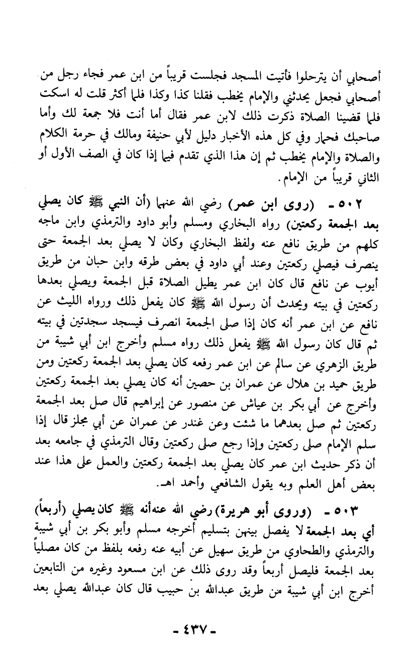 502 - (روى ابن عمر) رضي الله عنهما (أن النبي - صلى الله عليه وسلم - كان يصلي بعد الجمعة ركعتين) رواه البخاري ومسلم وأبو داود والترمذي وابن ماجه كلهم من طريق نافع عنه ولفظ البخاري وكان لا يصلي بعد الجمعة حتى ينصرف فيصلي ركعتين وعند أبي داود في بعض طرقه وابن حبان من طريق أيوب عن نافع قال كان ابن عمر يطيل الصلاة قبل الجمعة ويصلي بعدها ركعتين في بيته ويحدث أن رسول الله - صلى الله عليه وسلم - كان يفعل ذلك ورواه الليث عن نافع عن ابن عمر أنه كان إذا صلى الجمعة انصرف فيسجد سجدتين في بيته ثم قال كان رسول الله - صلى الله عليه وسلم - يفعل ذلك رواه مسلم وأخرج ابن أبي شيبة من طريق الزهري عن سالم عن ابن عمر رفعه كان يصلي بعد الجمعة ركعتين ومن طريق حميد بن هلال عن عمران بن حصين أنه كان يصلي بعد الجمعة ركعتين وأخرج عن أبي بكر بن عياش عن منصور عن إبراهيم قال صل بعد الجمعة ركعتين ثم صل بعدهما ما شئت وعن غندر عن عمران عن أبي مجلز قال إذا سلم الإمام صلى ركعتين وإذا رجع صلى ركعتين وقال الترمذي في جامعه بعد أن ذكر حديث ابن عمر كان يصلي بعد الجمعة ركعتين والعمل على هذا عند بعض أهل العلم وبه يقول الشافعي وأحمد اهـ.