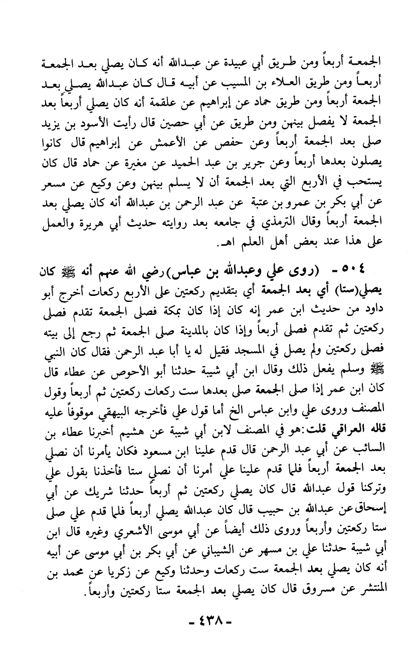 الجمعة أربعاً ومن طريق أبي عبيدة عن عبد الله أنه كان يصلي بعد الجمعة أربعاً ومن طريق العلاء بن المسيب عن أبيه قال كان عبد الله يصلي بعد الجمعة أربعاً ومن طريق حماد عن إبراهيم عن علقمة أنه كان يصلي أربعاً بعد الجمعة لا يفصل بينهن ومن طريق عن أبي حصين قال رأيت الأسود بن يزيد صلى بعد الجمعة أربعاً وعن حفص عن الأعمش عن إبراهيم قال كانوا يصلون بعدها أربعاً وعن جرير بن عبد الحميد عن مغيرة عن حماد قال كان يستحب في الأربع التي بعد الجمعة أن لا يسلم بينهن وعن وكيع عن مسعر عن أبي بكر بن عمرو بن عتبة عن عبد الرحمن بن عبد الله أنه كان يصلي بعد الجمعة أربعاً وقال الترمذي في جامعه بعد روايته حديث أبي هريرة والعمل على هذا عند بعض أهل العلم اهـ.