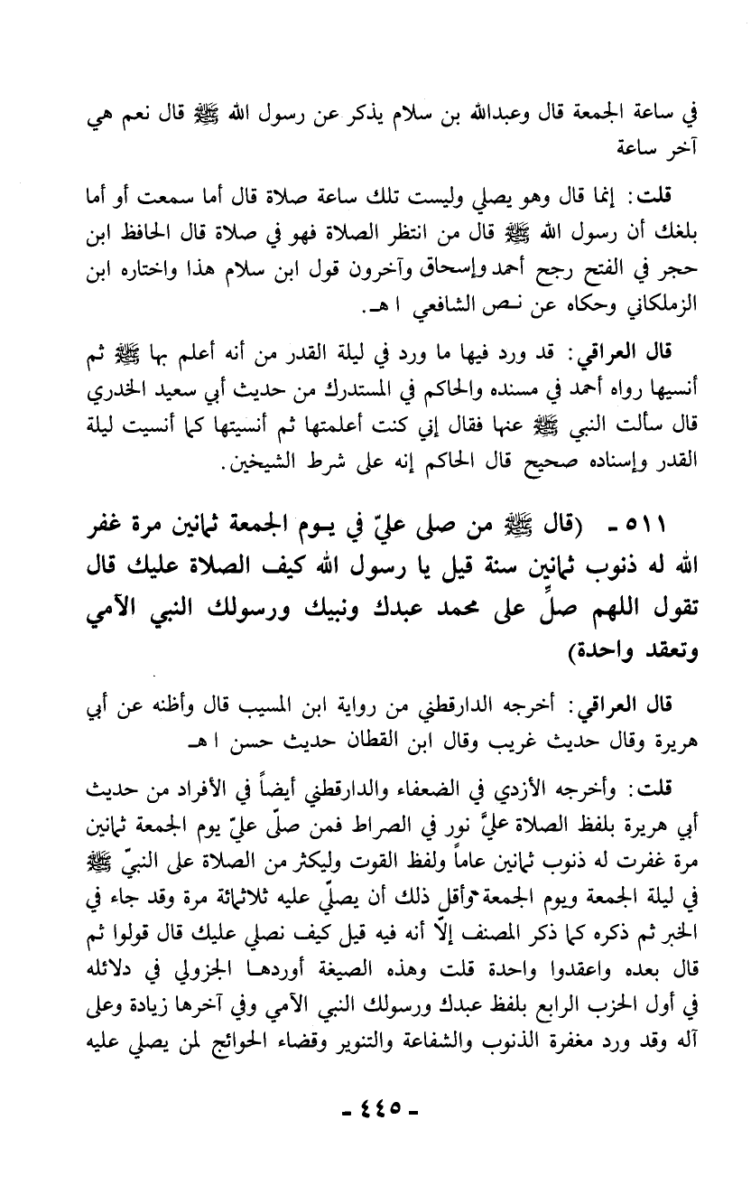 511 - (قال - صلى الله عليه وسلم - من صلى عليّ في يوم الجمعة ثمانين مرة غفر الله له ذنوب ثمانين سنة قيل يا رسول الله كيف الصلاة عليك قال تقول اللهم صل على محمد عبدك ونبيك ورسولك النبي الآمي وتعقد واحدة)