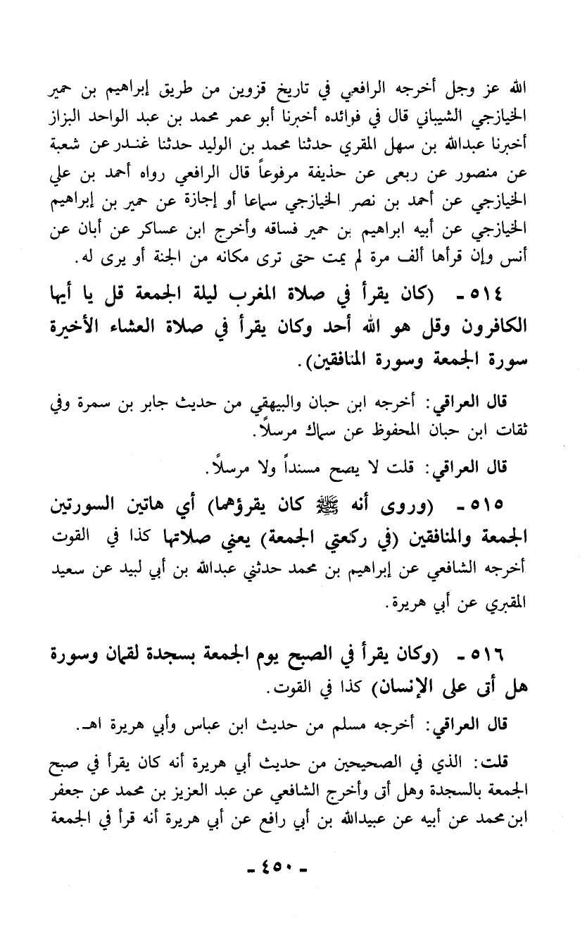 514 - (كان يقرأ في صلاة المغرب ليلة الجمعة قل يا أيها الكافرون وقل هو الله أحد وكان يقرأ في صلاة العشاء الأخيرة سورة الجمعة وسورة المنافقين).