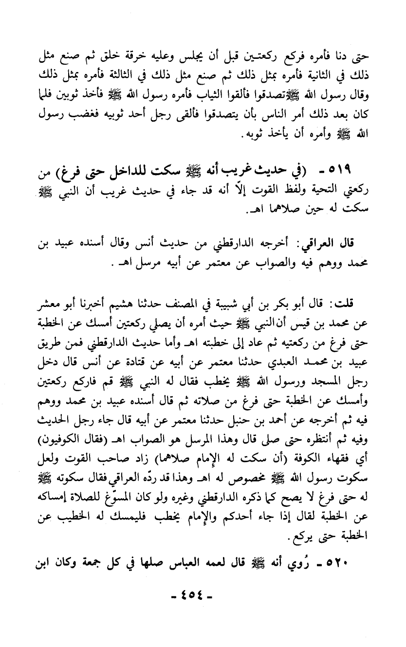 519 - (في حديث غريب أنه - صلى الله عليه وسلم - سكت للداخل حتى فرغ) من ركعتي التحية ولفظ القوت إلاَّ أنه قد جاء في حديث غريب أن النبي - صلى الله عليه وسلم - سكت له حين صلاهما اهـ.
