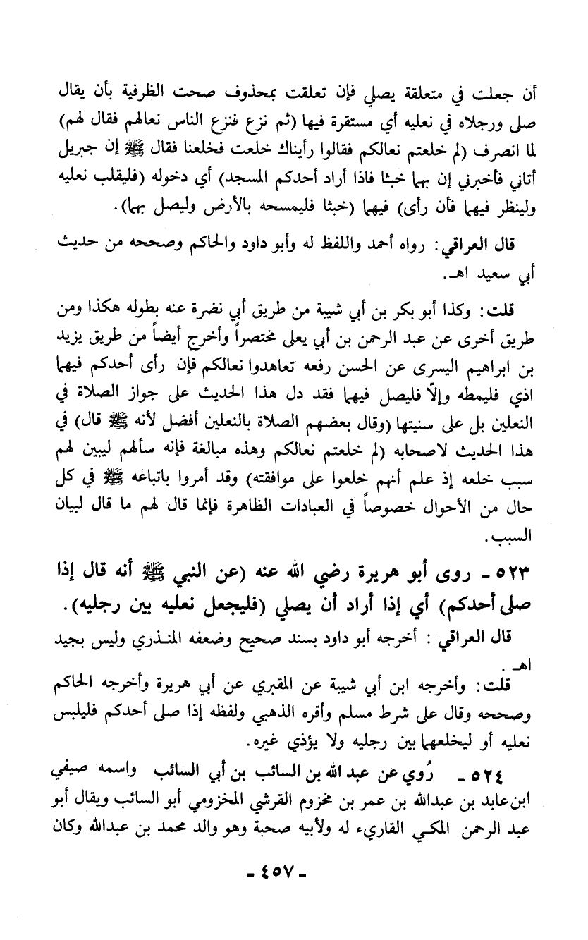 523 - روى أبو هريرة رضي الله عنه (عن النبي - صلى الله عليه وسلم - أنه قال إذا صلى أحدكم) أي إذا أراد أن يصلي (فليجعل نعليه بين رجليه).