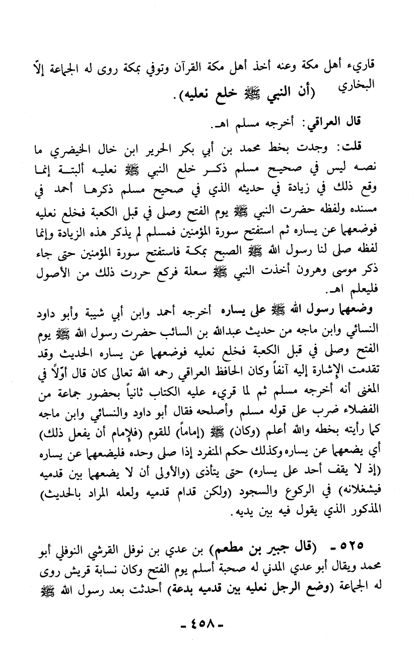 525 - (قال جبير بن مطعم) بن عدي بن نوفل القرشي النوفلي أبو محمد ويقال أبو عدي المدني له صحبة أسلم يوم الفتح وكان نسابة قريش روى له الجماعة (وضع الرجل نعليه بين قدميه بدعة) أحدثت بعد رسول الله - صلى الله عليه وسلم -