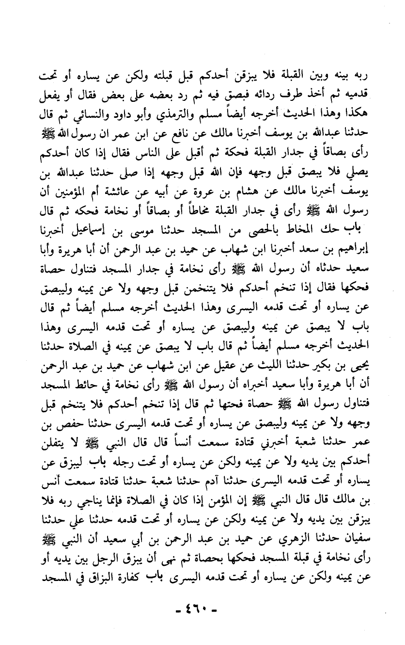 ربه بينه وبين القبلة فلا يبزقن أحدكم قبل قبلته ولكن عن يساره أو تحت قدميه ثم أخذ طرف ردائه فبصق فيه ثم رد بعضه على بعض فقال أو يفعل هكذا وهذا الحديث أخرجه أيضاً مسلم والترمذي وأبو داود والنسائي ثم قال حدثنا عبد الله بن يوسف أخبرنا مالك عن نافع عن ابن عمر أن رسول الله - صلى الله عليه وسلم - رأى بصاقاً في جدار القبلة فحكه ثم أقبل على الناس فقال إذا كان أحدكم يصلي فلا يبصق قبل وجهه فإن الله قبل وجهه إذا صلى حدثنا عبد الله بن يوسف أخبرنا مالك عن هشام بن عروة عن أبيه عن عائشة أم المؤمنين أن رسول الله - صلى الله عليه وسلم - رأى في جدار القبلة مخاطاً أو بصاقاً أو نخامة فحكه ثم قال باب حك المخاط بالحصى من المسجد حدثنا موسى بن إساعيل أخبرنا إبراهيم بن سعد أخبرنا ابن شهاب عن حميد بن عبد الرحمن أن أبا هريرة وأبا سعيد حدثاه أن رسول الله - صلى الله عليه وسلم - رأى نخامة في جدار المسجد فتناول حصاة فحكها فقال إذا تنخم أحدكم فلا يتنخمن قبل وجهه ولا عن يمينه وليبصق عن يساره أو تحت قدمه اليسرى وهذا الحديث أخرجه مسلم أيضاً ثم قال باب لا يبصق عن يمينه وليبصق عن يساره أو تحت قدمه اليسرى وهذا الحديث أخرجه مسلم أيضاً ثم قال باب لا يبصق عن يمينه في الصلاة حدثنا يحيى بن بكير حدثنا الليث عن عقيل عن ابن شهاب عن حميد بن عبد الرحمن أن أبا هريرة وأبا سعيد أخبراه أن رسول الله - صلى الله عليه وسلم - رأى نخامة في حائط المسجد فتناول رسول الله - صلى الله عليه وسلم - حصاة فحتها ثم قال إذا تنخم أحدكم فلا يتنخم قبل وجهه ولا عن يمينه وليبصق عن يساره أو تحت قدمه اليسرى حدثنا حفص بن عمر حدثنا شعبة أخبرني قتادة سمعت أنساً قال قال النبي - صلى الله عليه وسلم - لا يتفلن أحدكم بين يديه ولا عن يمينه ولكن عن يساره أو تحت رجله باب ليبزق عن يساره أو تحت قدمه اليسرى حدثنا آدم حدثنا شعبة حدثنا قتادة سمعت أنس بن مالك قال قال النبي - صلى الله عليه وسلم - إن المؤمن إذا كان في الصلاة فإنما يناجي ربه فلا يبزقن بين يديه ولا عن يمينه ولكن عن يساره أو تحت قدمه حدثنا علي حدثنا سفيان حدثنا الزهري عن حميد بن عبد الرحمن بن أبي سعيد أن النبي - صلى الله عليه وسلم - رأى نخامة في قبلة المسجد فحكها بحصاة ثم نهى أن يبزق الرجل بين يديه أو عن يمينه ولكن عن يساره أو تحت قدمه اليسرى باب كفارة البزاق في المسجد