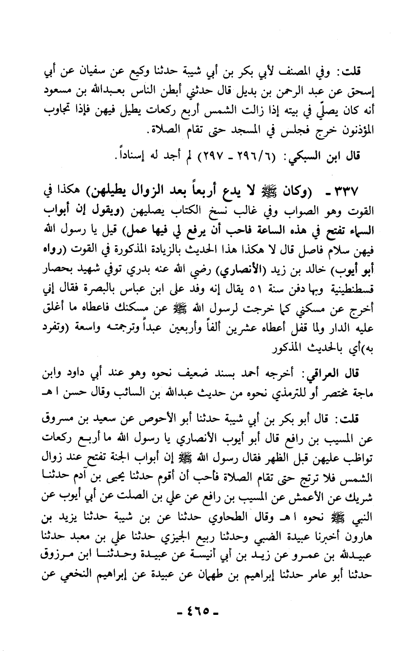 قلت: قال أبو بكر بن أبي شيبة حدثنا أبو الأحوص عن سعيد بن مسروق عن المسيب بن رافع قال أبو أيوب الأنصاري يا رسول الله ما أربع ركعات تواظب عليهن قبل الظهر فقال رسول الله - صلى الله عليه وسلم - إن أبواب الجنة تفتح عند زوال الشمس فلا ترتج حتى تقام الصلاة فأحب أن أقوم حدثنا يحيى بن آدم حدثنا شريك عن الأعمش عن المسيب بن رافع عن علي بن الصلت عن أبي أيوب عن النبي - صلى الله عليه وسلم - نحوه اهـ وقال الطحاوي حدثنا عن بن شيبة حدثنا يزيد بن هارون أخبرنا عبيدة الضبي وحدثنا ربيع الجيزي حدثنا علي بن معبد حدثنا عبيد الله بن عمرو عن زيد بن أبي أنيسة عن عبيدة وحدثنا ابن مرزوق حدثنا أبو عامر حدثنا إبراهيم بن طهمان عن عبيدة عن إبراهيم النخعي عن
