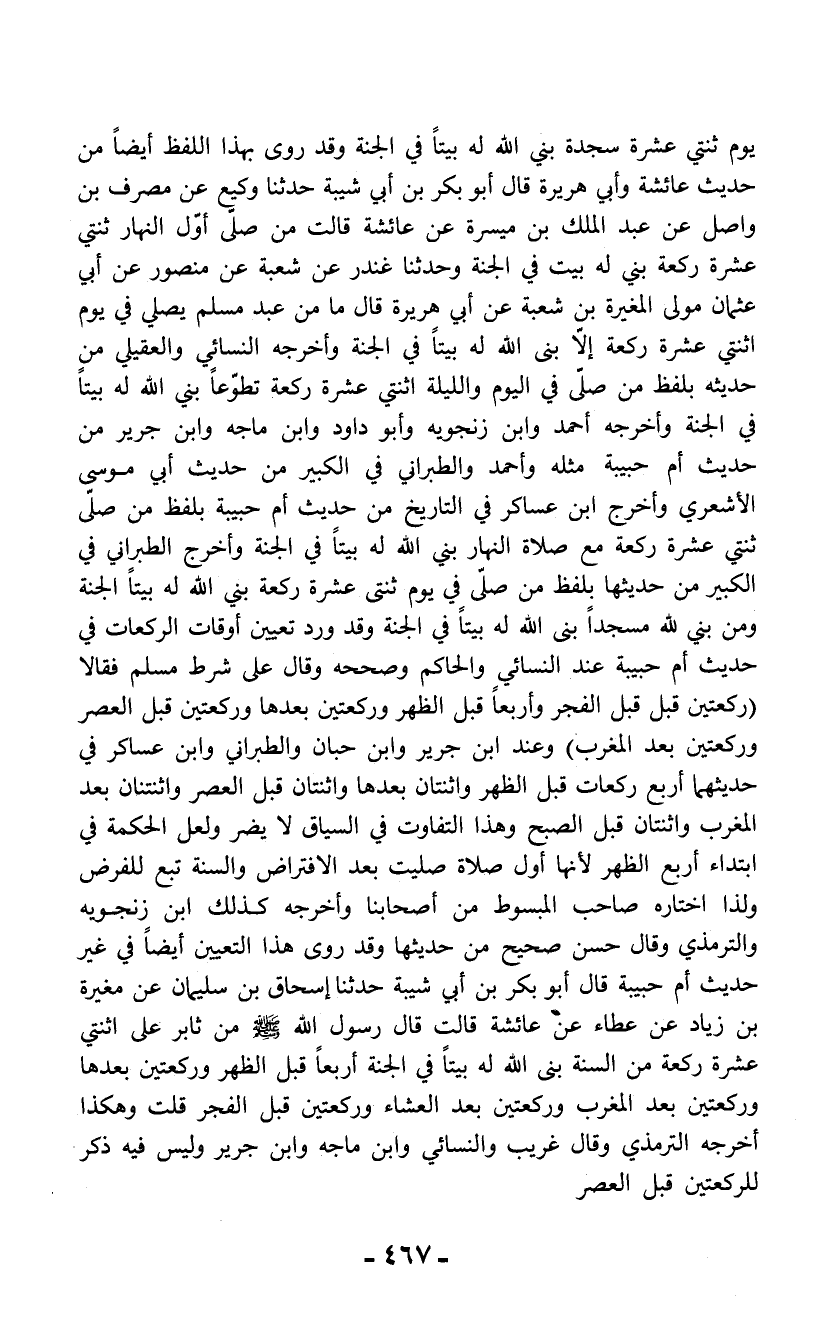 يوم ثنتي عشرة سجدة بنى الله له بيتاً في الجنة وقد روى بهذا اللفظ أيضاً من حديث عائشة وأبي هريرة قال أبو بكر بن أبي شيبة حدثنا وكيع عن مصرف بن واصل عن عبد الملك بن ميسرة عن عائشة قالت من صلّى أوّل النهار ثنتي عشرة ركعة بني له بيت في الجنة وحدثنا غندر عن شعبة عن منصور عن أبي عثمان مولى المغيرة بن شعبة عن أبي هريرة قال ما من عبد مسلم يصلي في يوم اثنتي عشرة ركعة إلا بنى الله له بيتاً في الجنة وأخرجه النسائي والعقيلي من حديثه بلفظ من صلى في اليوم والليلة اثنتي عشرة ركعة تطوعاً بني الله له بيتاً في الجنة وأخرجه أحمد وابن زنجويه وأبو داود وابن ماجه وابن جرير من حديث أم حبيبة مثله وأحمد والطبراني في الكبير من حديث أبي موسى الأشعري وأخرج ابن عساكر في التاريخ من حديث أم حبيبة بلفظ من صلّى ثنتي عشرة ركعة مع صلاة النهار بني الله له بيتاً في الجنة وأخرج الطبراني في الكبير من حديثها بلفظ من صلّى في يوم ثنتى عشرة ركعة بني الله له بيتاً الجنة ومن بنى لله مسجداً بنى الله له بيتاً في الجنة وقد ورد تعيين أوقات الركعات في حديث أم حبيبة عند النسائي والحاكم وصححه وقال على شرط مسلم فقالا (ركعتين قبل الفجر وأربعاً قبل الظهر وركعتين بعدها وركعتين قبل العصر وركعتين بعد المغرب) وعند ابن جرير وابن حبان والطبراني وابن عساكر في حديثهما أربع ركعات قبل الظهر واثنتان بعدها واثنتان قبل العصر واثنتنان بعد المغرب واثنتان قبل الصبح وهذا التفاوت في السياق لا يضر ولعل الحكمة في ابتداء أربع الظهر لأنها أول صلاة صليت بعد الافتراض والسنة تبع للفرض ولذا اختاره صاحب المبسوط من أصحابنا وأخرجه كذلك ابن زنجويه والترمذي وقال حسن صحيح من حديثها وقد روى هذا التعيين أيضاً في غير حديث أم حبيبة قال أبو بكر بن أبي شيبة حدثنا إسحاق بن سليمان عن مغيرة بن زياد عن عطاء عن عائشة قالت قال رسول الله - صلى الله عليه وسلم - من ثابر على اثنتي عشرة ركعة من السنة بنى الله له بيتاً في الجنة أربعاً قبل الظهر وركعتين بعدها وركعتين بعد المغرب وركعتين بعد العشاء وركعتين قبل الفجر قلت وهكذا أخرجه الترمذي وقال غريب والنسائي وابن ماجه وابن جرير وليس فيه ذكر للركعتين قبل العصر