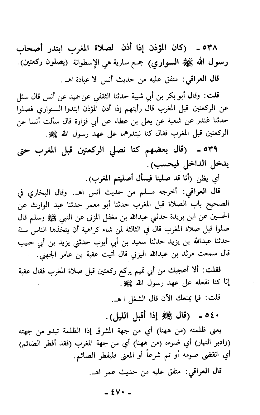 538 - (كان المؤذن إذا أذن لصلاة المغرب ابتدر أصحاب رسول الله - صلى الله عليه وسلم - السواري) جمع سارية هي الإسطوانة (يصلون ركعتين).