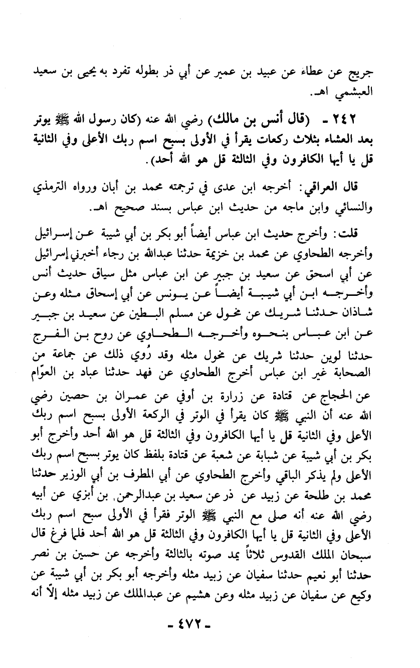 242 - (قال أنس بن مالك) رضي الله عنه (كان رسول الله - صلى الله عليه وسلم - يوتر بعد العشاء بثلاث ركعات يقرأ في الأولى بسبح اسم ربك الأعلى وفي الثانية قل يا أيها الكافرون وفي الثالثة قل هو الله أحد).