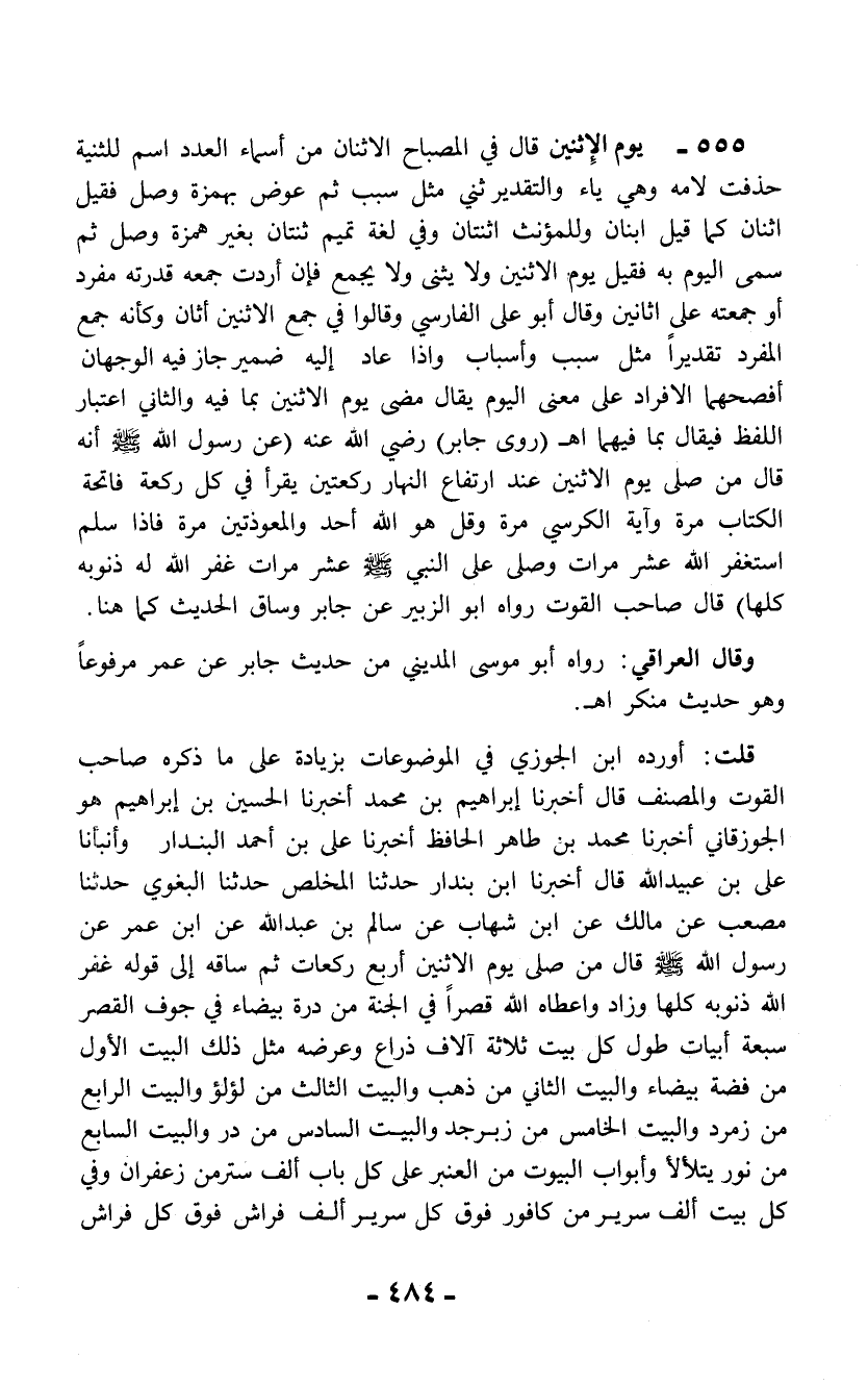 555 - يوم الإثنين قال في المصباح الاثنان من أسماء العدد اسم للثنية حذفت لامه وهي ياء والتقدير ثني مثل سبب ثم عوض بهمزة وصل فقيل اثنان كما قيل ابنان وللمؤنث اثنتان وفي لغة تميم ثنتان بغير همزة وصل ثم سمى اليوم به فقيل يوم الاثنين ولا يثنى ولا يجمع فإن أردت جمعه قدرته مفرد أو جمعته على اثانين وقال أبو على الفارسي وقالوا في جمع الاثنين أثان وكأنه جمع المفرد تقديراً مثل سبب وأسباب وإذا عاد إليه ضمير جاز فيه الوجهان أفصحهما الأفراد على معنى اليوم يقال مضى يوم الاثنين بما فيه والثاني اعتبار اللفظ فيقال بما فيهما اهـ (روى جابر) رضي الله عنه (عن رسول الله - صلى الله عليه وسلم - أنه قال من صلى يوم الاثنين عند ارتفاع النهار ركعتين يقرأ في كل ركعة فاتحة الكتاب مرة وآية الكرسي مرة وقل هو الله أحد والمعوذتين مرة فإذا سلم استغفر الله عشر مرات وصلى على النبي - صلى الله عليه وسلم - عشر مرات غفر الله له ذنوبه كلها) قال صاحب القوت رواه أبو الزبير عن جابر وساق الحديث كما هنا.