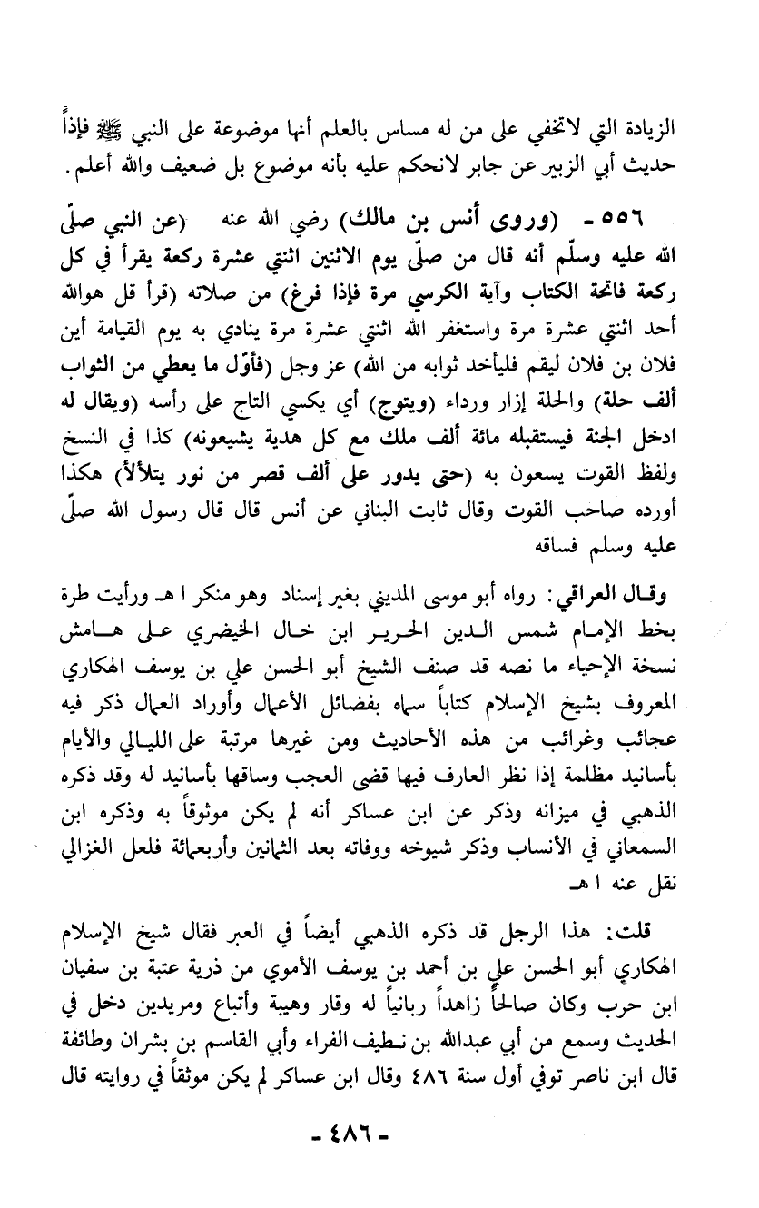 وقال العراقي: رواه أبو موسى المديني بغير إسناد وهو منكر اهـ ورأيت طرة بخط الإمام شمس الدين الحرير ابن خال الخيضري على هامش نسخة الإحياء ما نصه قد صنف الشيخ أبو الحسن علي بن يوسف الهكاري المعروف بشيخ الإسلام كتاباً سماه بفضائل الأعمال وأوراد العمال ذكر فيه عجائب وغرائب من هذه الأحاديث ومن غيرها مرتبة على الليالي والأيام بأسانيد مظلمة إذا نظر العارف فيها قضى العجب وساقها بأسانيد له وقد ذكره الذهبي في ميزانه وذكر عن ابن عساكر أنه لم يكن موثوقاً به وذكره ابن السمعاني في الأنساب وذكر شيوخه ووفاته بعد الثمانين وأربعمائة فلعل الغزالي نقل عنه اهـ