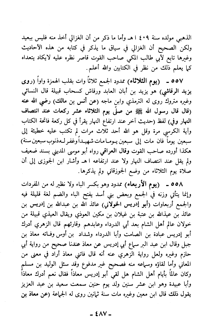 الذهبي مولده سنة 1409هـ وأما ما ذكر من أن الغزالي أخذ منه فليس ببعيد ولكن الصحيح أن الغزالي في سياق ما يذكر في كتابه من هذه الأحاديث وغيرها تابع لأبى طالب المكي صاحب القوت قاصر نظره عليه لا يكاد يتعداه كما يعلم ذلك من نظر في الكتابين والله أعلم.