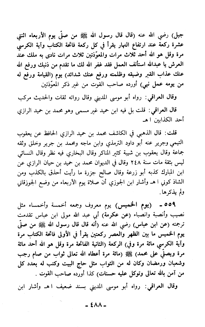 قلت: قال الذهبي فى الكاشف محمد بن حميد الرازي الحافظ عن يعقوب التيمي وجرير عنه أبو داود الترمذي وابن ماجه ومحمد بن جرير وخلق وثقه جماعة وقال يعقوب بن شيبة كثير المناكر وقال البخاري فيه نظر وقال النسائي ليس بثقة مات سنة 248 وقال في الديوان محمد بن حميد بن حيان الرازي عن ابن المبارك كذبه أبو زرعة وقال صالح جزرة ما رأيت أحذق بالكذب ومن الشاذكوني اهـ وأشار ابن الجوزي أن صلاة يوم الأربعاء من وضع الجوزقاني ولم يذكرها.