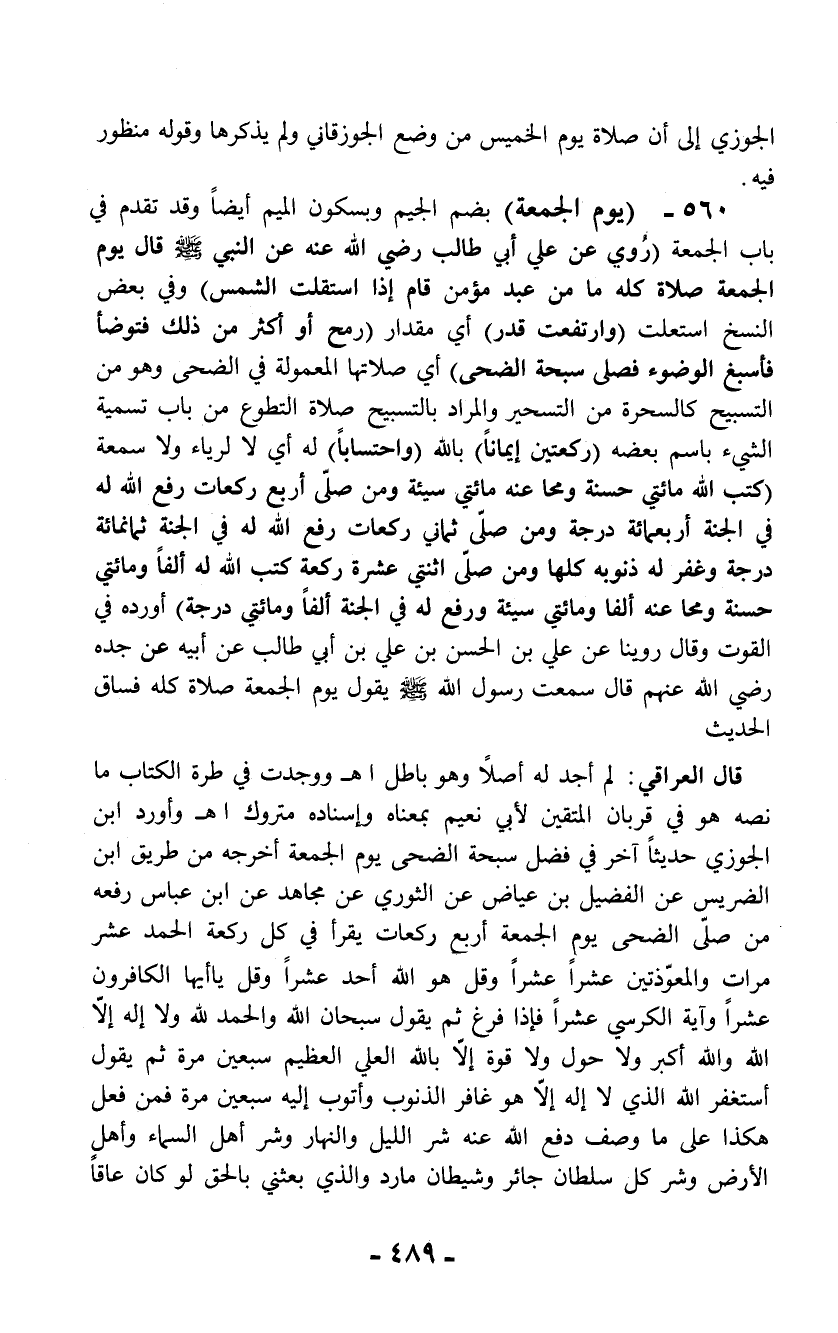 قال العراقي: لم أجد له أصلاً وهو باطل اهـ ووجدت في طرة الكتاب ما نصه هو في قربان المتقين لأبي نعيم بمعناه وإسناده متروك اهـ وأورد ابن الجوزي حديثاً آخر في فضل سبحة الضحى يوم الجمعة أخرجه من طريق ابن الضريس عن الفضيل بن عياض عن الثوري عن مجاهد عن ابن عباس رفعه من صلّى الضحى يوم الجمعة أربع ركعات يقرأ في كل ركعة الحمد عشر مرات والمعوّذتين عشراً عشراً وقل هو الله أحد عشراً وقل يا أيها الكافرون عشراً وآية الكرسي عشراً فإذا فرغ ثم يقول سبحان الله والحمد لله ولا إله إلا الله والله أكبر ولا حول ولا قوة إلا بالله العلي العظيم سبعين مرة ثم يقول أستغفر الله الذي لا إله إلاّ هو غافر الذنوب وأتوب إليه سبعين مرة فمن فعل هكذا على ما وصف دفع الله عنه شر الليل والنهار وشر أهل السماء وأهل الأرض وشر كل سلطان جائر وشيطان مارد والذي بعثني بالحق لو كان عاقاً