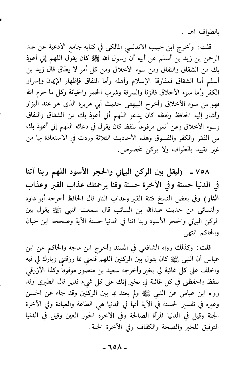 قلت: وأخرج ابن حبيب الأندلسي المالكي في كتابه جامع الأدعية عن عبد الرحمن بن زيد بن أسلم عن أبيه أن رسول الله - صلّى الله عليه وسلم - كان يقول اللهم إني أعوذ بك من الشقاق والنفاق ومن سوء الأخلاق ومن كل أمر لا يطاق قال زيد بن أسلم أما الشقاق فمفارقة الإسلام وأهله وأما النفاق فإظهار الإيمان وإسرار الكفر وأما سوء الأخلاق فالزنا والسرقة وشرب الخمر والخيانة وكل ما حرم الله فهو من سوء الأخلاق وأخرج البيهقي حديث أبي هريرة الذي هو عند البزار وأشار إليه الحافظ ولفظه كان يدعو اللهم أني أعوذ بك من الشقاق والنفاق وسوء الأخلاق وعن أنس مرفوعاً بلفظ كان يقول في دعائه اللهم إني أعوذ بك من الفقر والكفر والفسوق وهذه الأحاديث الثلاثة وردت في الاستعاذة بها من غير تقييد بالطواف ولا بركن مخصوص.