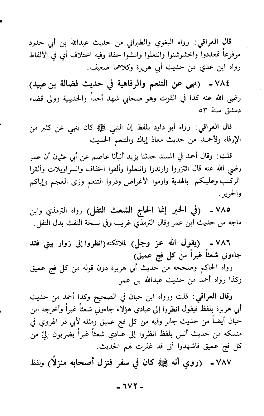 784 - (نهى عن التنعم والرفاهية في حديث فضالة بن عبيد) رضي الله عنه كذا في القوت وهو صحابي شهد أحداً والحديبية وولى قضاء دمشق سنة 53