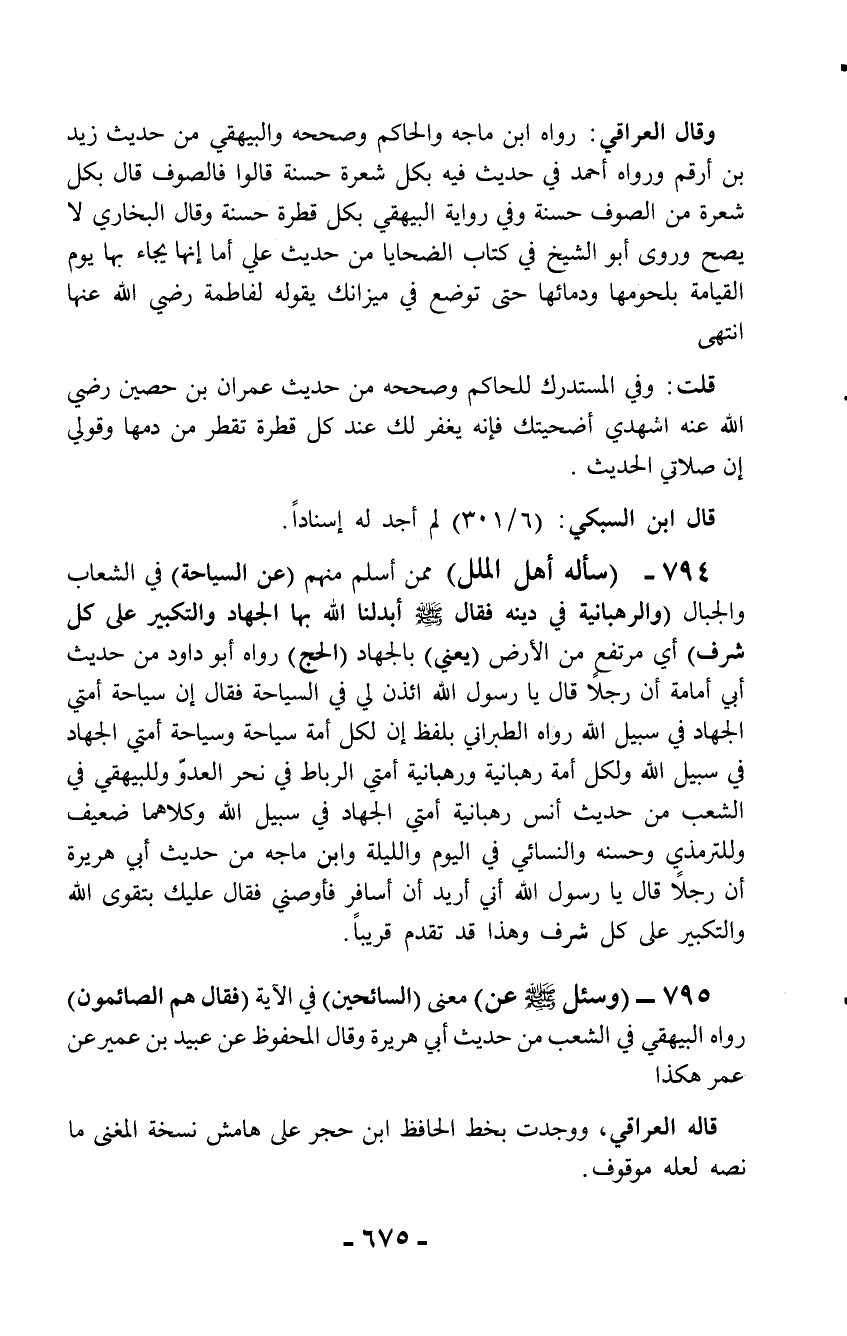 794 - (سأله أهل الملل) ممن أسلم منهم (عن السياحة) في الشعاب والجبال (والرهبانية في دينه فقال - صلّى الله عليه وسلم - أبدلنا الله بها الجهاد والتكبير على كل شرف) أي مرتفع من الأرض (يعني) بالجهاد (الحج) رواه أبو داود من حديث أبي أمامة أن رجلاً قال يا رسول الله ائذن لي في السياحة فقال إن سياحة أمتي الجهادفي سبيل الله رواه الطبراني بلفظ إن لكل أمة سياحة وسياحة أمتي الجهاد في سبيل الله ولكل أمة رهبانية ورهبانية أمتي الرباط في نحر العدوّ وللبيهقي في الشعب من حديث أنس رهبانية أمتي الجهاد في سبيل الله وكلاهما ضعيف وللترمذي وحسنه والنسائي في اليوم والليلة وابن ماجه من حديث أبي هريرة أن رجلاً قال يا رسول الله أني أريد أن أسافر فأوصني فقال عليك بتقوى الله والتكبير على كل شرف وهذا قد تقدم قريباً.