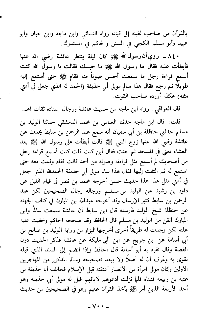 قلت: قال ابن ماجه حدثنا العباس بن محمد الدمشقي حدثنا الوليد بن مسلم حدثني حنظلة بن أبي سفيان أنه سمع عبد الرحمن بن سابط يحدث عن عائشة رضي الله عنها زوج النبي - صلّى الله عليه وسلم - قالت أبطأت على رسول الله - صلّى الله عليه وسلم - بعد العشاء تعني في المسجد ثم جئت فقال أين كنت قلت كنت أسمع قراءة رجل من أصحابك لم أسمع مثل قراءته وصوته من أحد قالت فقام وقمت معه حتى استمع له ثم التفت إليها فقال هذا سالم مولى أبي حذيفة الحمد لله الذي جعل في أمتي مثل هذا هذا حديث حسن أخرجه محمد بن نصر في قيام الليل عن داود بن رشيد عن الوليد بن مسلم ورجاله رجال الصحيحين لكن عبد الرحمن بن سابط كثير الإرسال وقد أخرجه عبد الله بن المبارك في كتاب الجهاد عن حنظلة شيخ الوليد فأرسله قال ابن سابط أن عائشة سمعت سالماً وابن المبارك أتقن من الوليد بن مسلم قال الحافظ وقد صححه الحاكم وخفيت عليه علته لكن وجدت له طريقاً أخرى أخرجها البزار من رواية الوليد بن صالح بن أبي أسامة عن ابن جريج عن ابن أبي مليكة عن عائشة فذكر الحديث دون القصة وقال تفرد به أبو أسامة قال الحافظ وإذا انضم إلى السند الذي قبله تقوى به وعُرف أن له أصلاً ولا يبعد تصحيحه وسالم المذكور من المهاجرين الأولين وكان مولى امرأة من الأنصار أعتقته قبل الإسلام فحالف أبا حذيفة بن عتبة بن ربيعة فتبناه فلما نزلت أدعوهم لآبائهم قيل له مولى أبي حذيفة وهو أحد الأربعة الذين أمر - صلّى الله عليه وسلم - بأخذ القرآن عنهم وهو في الصحيحين من حديث