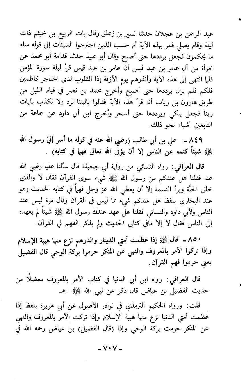 850 - قال - صلّى الله عليه وسلم - إذا عظمت أمتي الدينار والدرهم نزع منها هيبة الإسلام وإذا تركوا الأمر بالمعروف والنهي عن المنكر حرموا بركة الوحي قال الفضيل يعني حرموا فهم القرآن.
