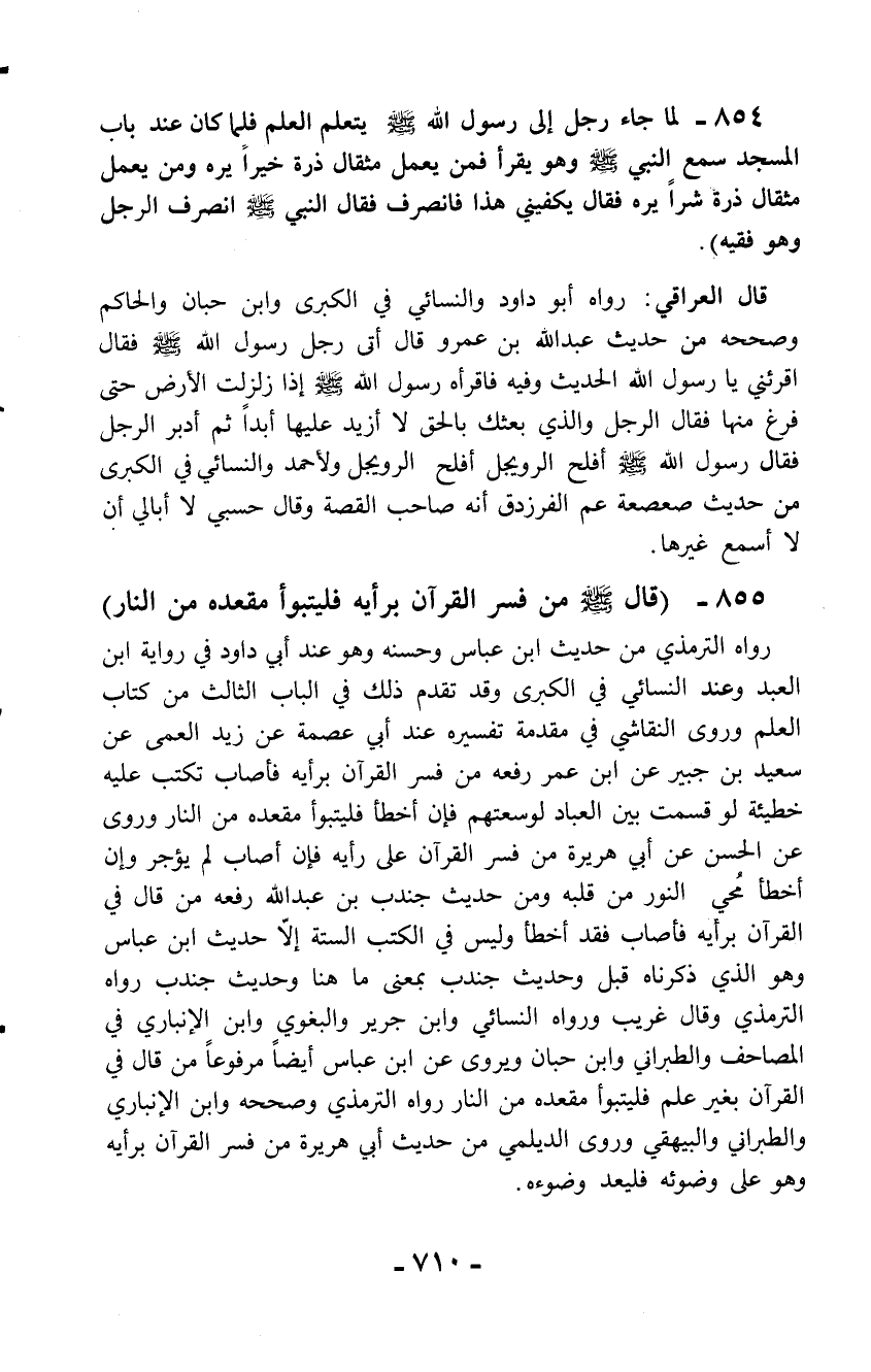 855 - (قال - صلّى الله عليه وسلم - من فسر القرآن برأيه فليتبوأ مقعده من النار) رواه الترمذي من حديث ابن عباس وحسنه وهو عند أبي داود في رواية ابن العبد وعند النسائي في الكبرى وقد تقدم ذلك في الباب الثالث من كتاب العلم وروى النقاشي في مقدمة تفسيره عند أبي عصمة عن زيد العمى عن سعيد بن جبير عن ابن عمر رفعه من فسر القرآن برأيه فأصاب تكتب عليه خطيئة لو قسمت بين العباد لوسعتهم فإن أخطأ فليتبوأ مقعده من النار وروى عن الحسن عن أبي هريرة من فسر القرآن على رأيه فإن أصاب لم يؤجر وإن أخطأ مُحي النور من قلبه ومن حديث جندب بن عبد الله رفعه من قال في القرآن برأيه فأصاب فقد أخطأ وليس في الكتب الستة إلاَّ حديث ابن عباس وهو الذي ذكرناه قبل وحديث جندب بمعنى ما هنا وحديث جندب رواه الترمذي وقال غريب ورواه النسائي وابن جرير والبغوي وابن الإنباري في المصاحف والطبراني وابن حبان ويروى عن ابن عباس أيضاً مرفوعاً من قال في القرآن بغير علم فليتبوأ مقعده من النار رواه الترمذي وصححه وابن الإنباري والطبراني والبيهقي وروى الديلمي من حديث أبي هريرة من فسر القرآن برأيه وهو على وضوئه فليعد وضوءه.