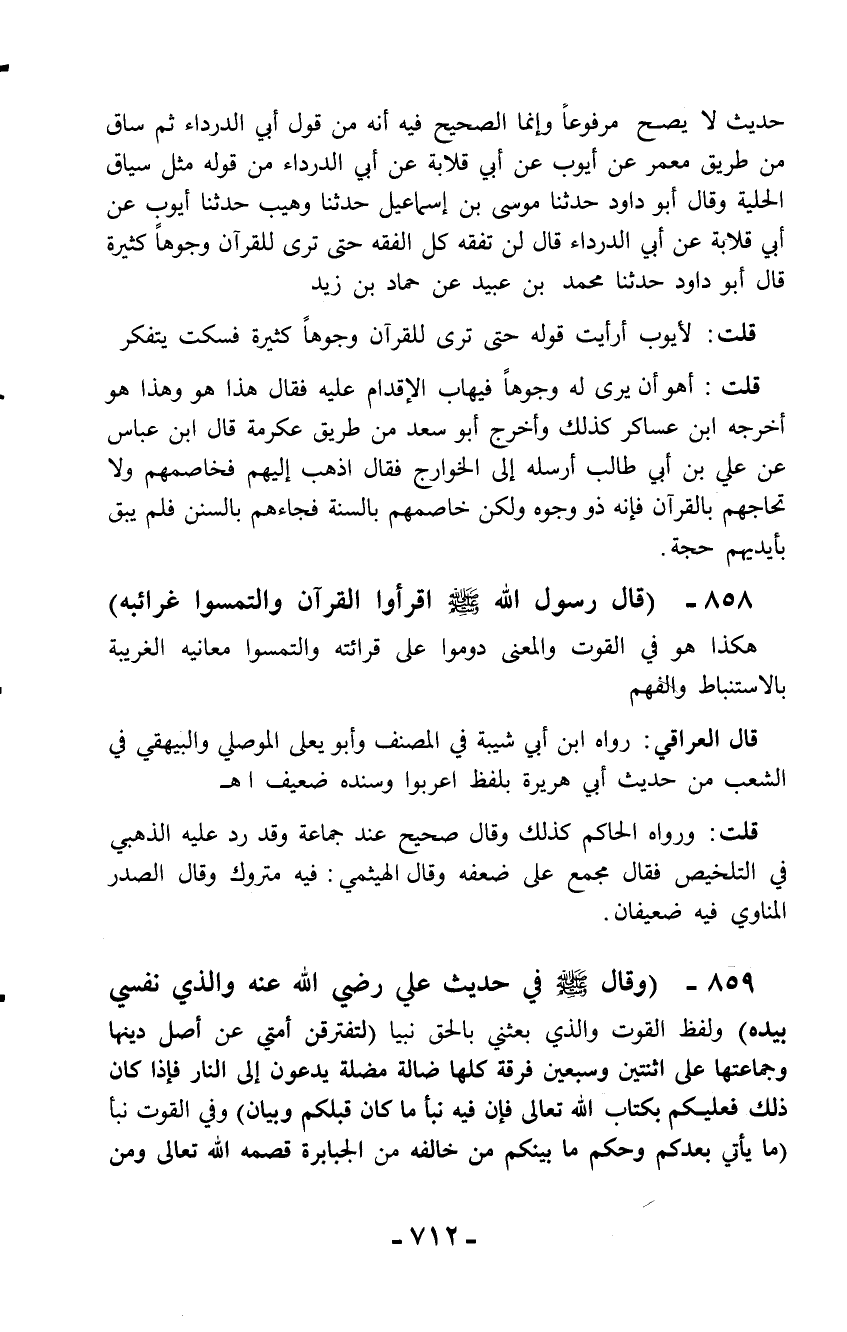 حديث لا يصح مرفوعاً وإنما الصحيح فيه أنه من قول أبي الدرداء ثم ساق من طريق معمر عن أيوب عن أبي قلابة عن أبي الدرداء من قوله مثل سياق الحلية وقال أبو داود حدثنا موسى بن إسماعيل حدثنا وهيب حدثنا أيوب عن أبي قلابة عن أبي الدرداء قال لن تفقه كل الفقه حتى ترى للقرآن وجوهاً كثيرة قال أبو داود حدثنا محمد بن عبيد عن حماد بن زيد