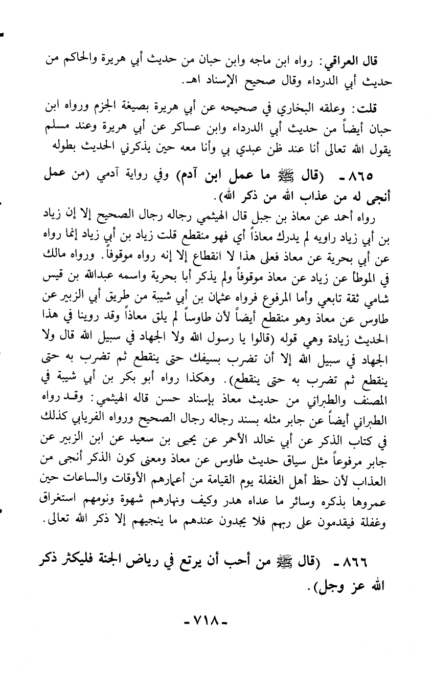 865 - (قال - صلّى الله عليه وسلم - ما عمل ابن آدم) وفي رواية آدمي (من عمل أنجى له من عذاب الله من ذكر الله).
