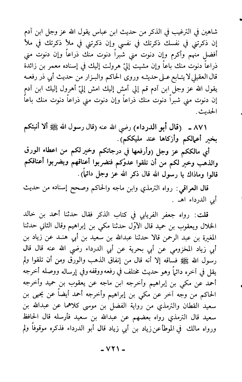 871 - (قال أبو الدرداء) رضي الله عنه (قال رسول الله - صلّى الله عليه وسلم - ألا أنبئكم بخير أعمالكم وأزكاها عند مليككم).