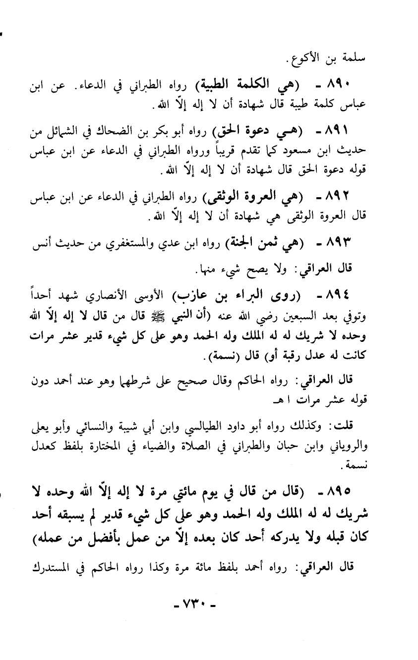 894 - (روى البراء بن عازب) الأوسى الأنصاري شهد أحداً وتوفي بعد السبعين رضي الله عنه (أن النبي - صلّى الله عليه وسلم - قال من قال لا إله إلاَّ الله وحده لا شريك له له الملك وله الحمد وهو على كل شيء قدير عشر مرات كانت له عدل رقبة أو) قال (نسمة).