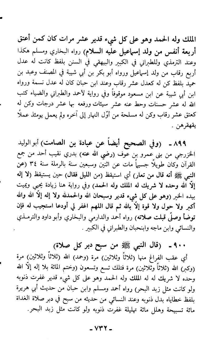 الملك وله الحمد وهو على كل شيء قدير عشر مرات كان كمن أعتق أربعة أنفس من ولد إسماعيل عليه السلام) رواه البخاري ومسلم هكذا وعند الترمذي وللطبراني في الكبير والبيهقي في السنن بلفظ كانت له عدل أربع رقاب من ولد إسماعيل ورواه أبو بكر بن أبي شيبة في المصنف وعبد بن حميد بلفظ كن له كعدل عشر رقاب وعند ابن حبان كان له عدل نسمة ورواه ابن أبي شيبة عن ابن مسعود موقوفاً وفي رواية لأحمد والطبراني والضياء كتب الله له عشر حسنات وحط عنه عشر سيئات ورفعه بها عشر درجات وكن له كعتق عشر رقاب وكن له مسلحة من أوّل النهار إلى آخره ولم يعمل يومئذ عملاً يقهقرهن.