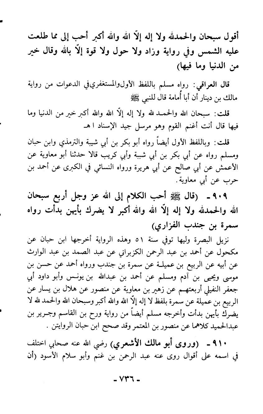 909 - (قال - صلّى الله عليه وسلم - أحب الكلام إلى الله عز وجل أربع سبحان الله والحمد لله ولا إله إلاَّ الله والله أكبر لا يضرك بأيهن بدأت رواه سمرة بن جندب الفزاري)